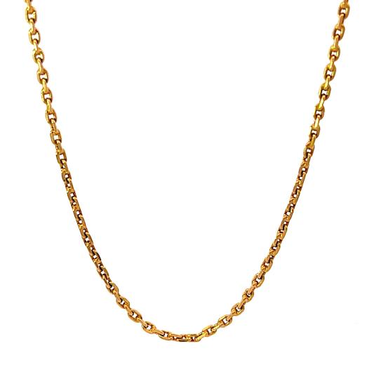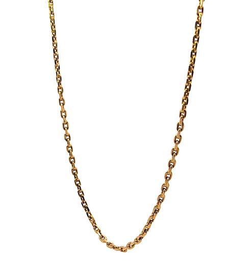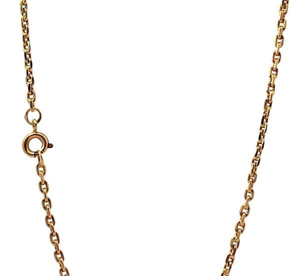 Řetízek z růžového zlata o ryzosti 585/1000, punc čejka. Váha 10,19 g, délka 56 cm, v nejširším bodě 2 mm.