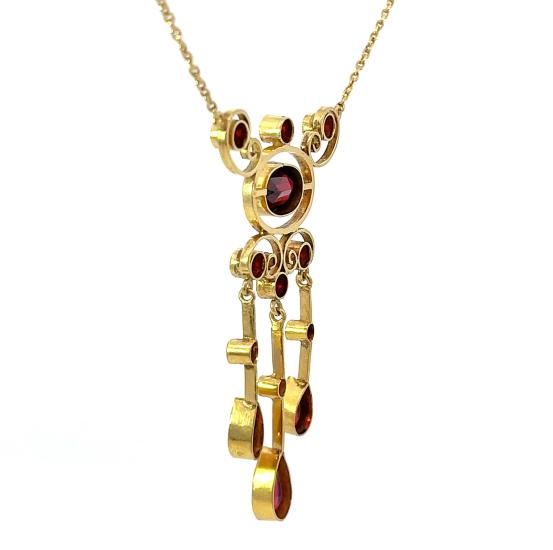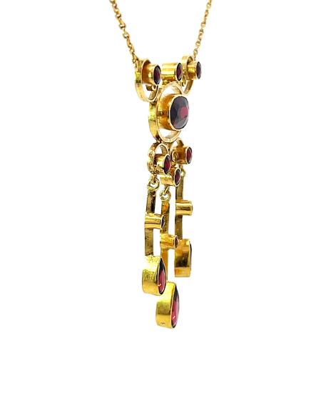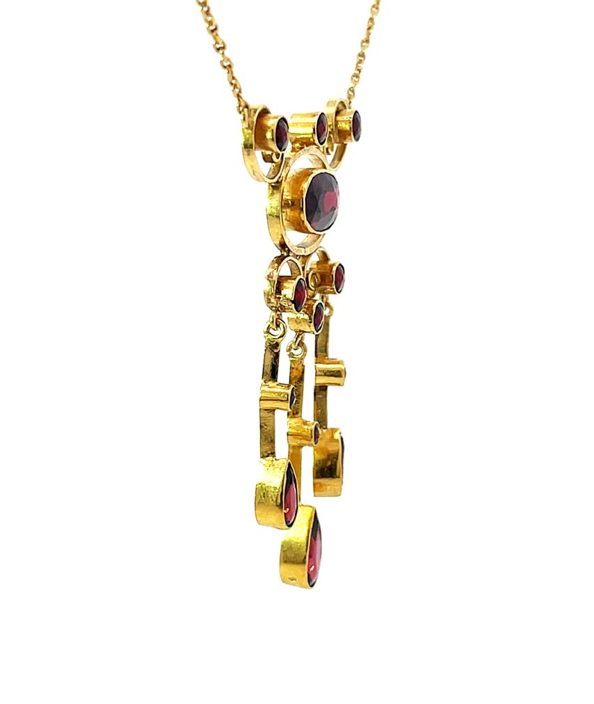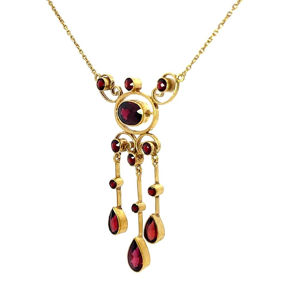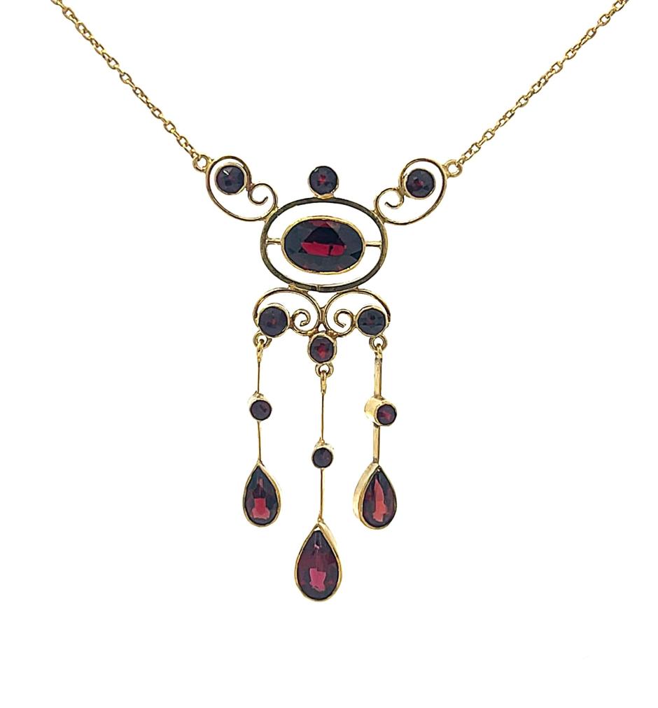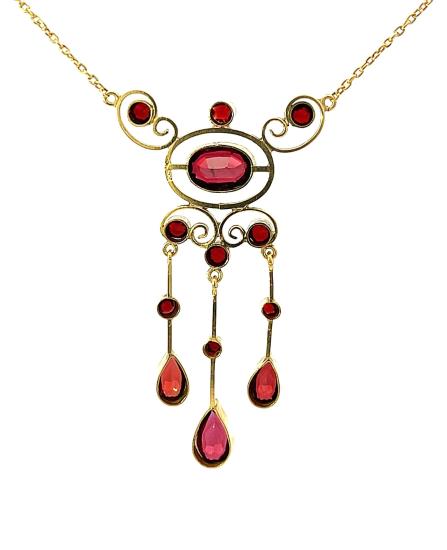 Starožitný krásný zlatý kolier o ryzosti 580/1000, punc liška - Rakousko - Uhersko. Váha náhrdelníku je 8,55 g, délka 41 cm, délka závěsu je 5,5 cm.