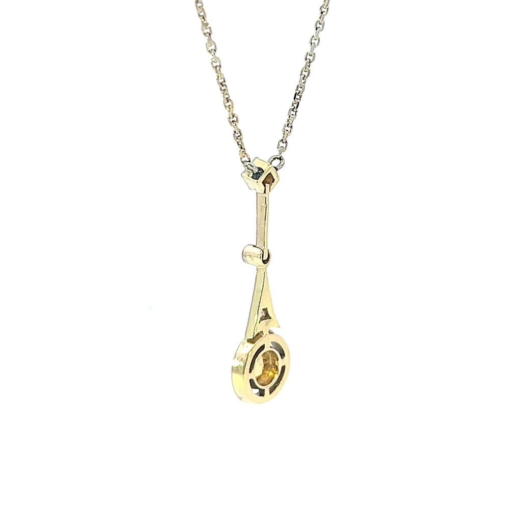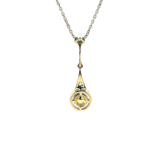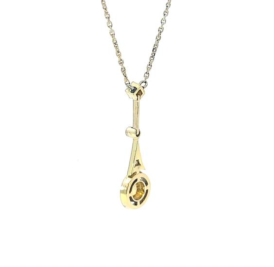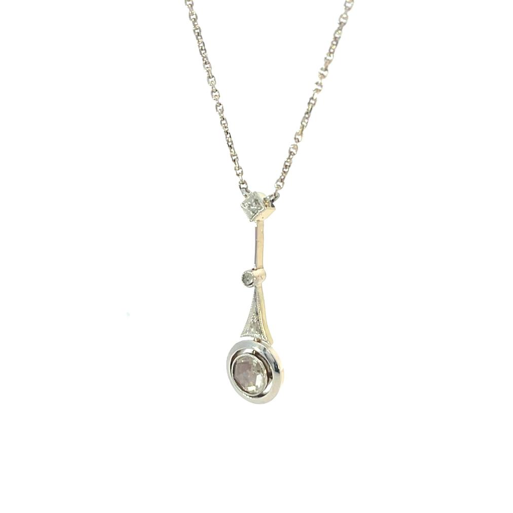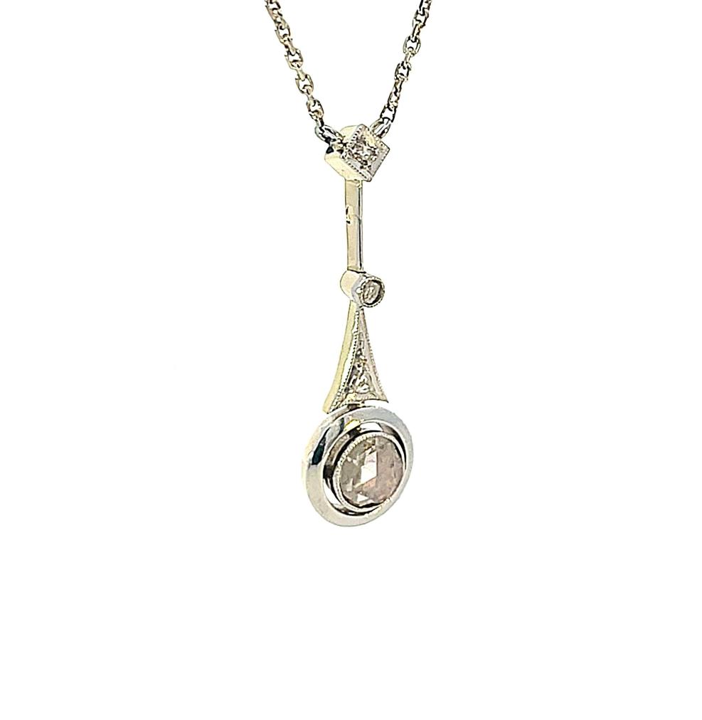 Kolier z bílého zlata o ryzosti 585/1000, punc lyra a ryz. číslo 585. Váha 4,26 g, délka řetízku včetně přívěsu 47 cm, šířka řetízku 1 mm, výška přívěsu 29 mm, v nejširším bodě 9 mm. Kámen - přírodní diamant jednoduchého brusu rozeta - 1 ks, cca 0,40 ct. Kámen - přírodní diamant routa - 3 ks.