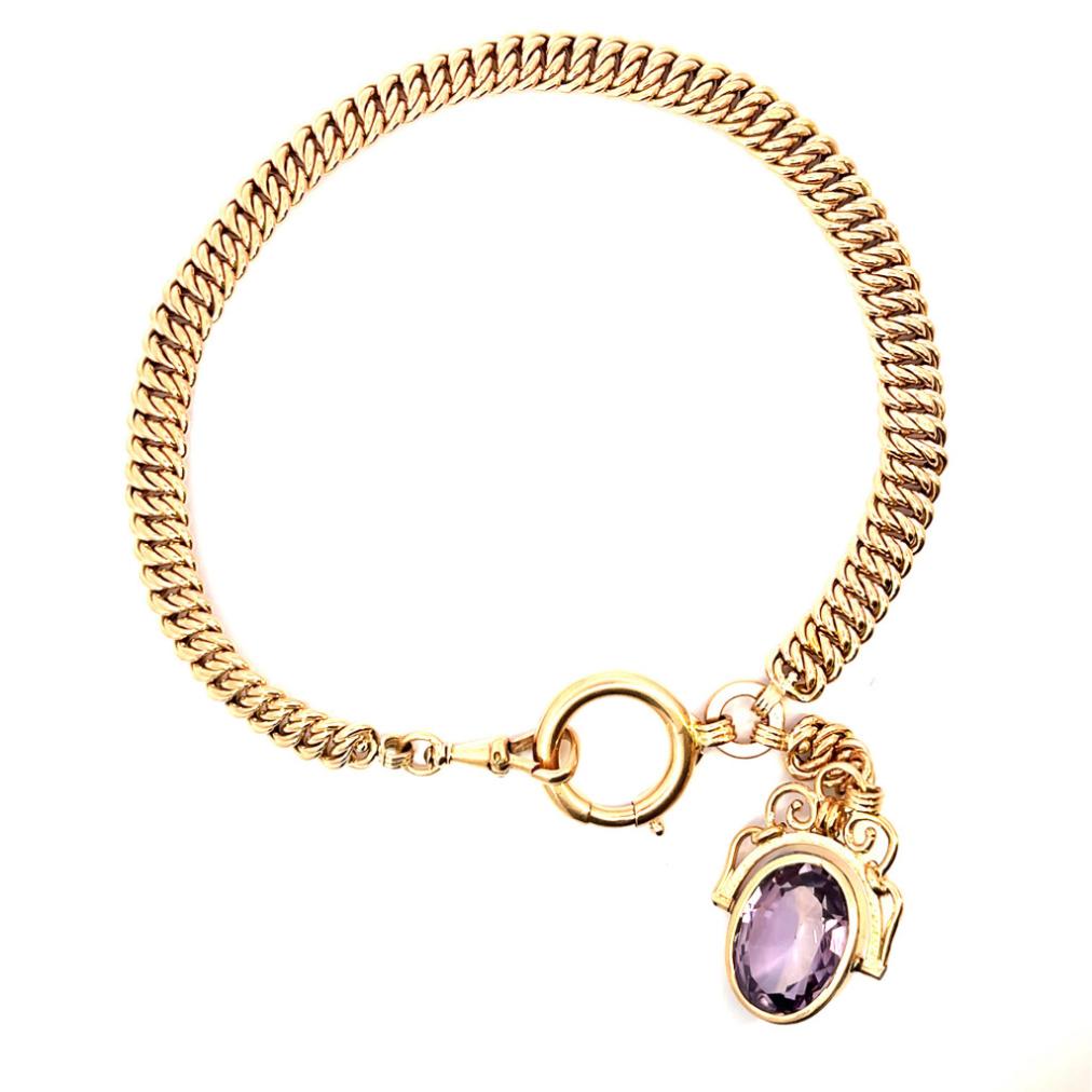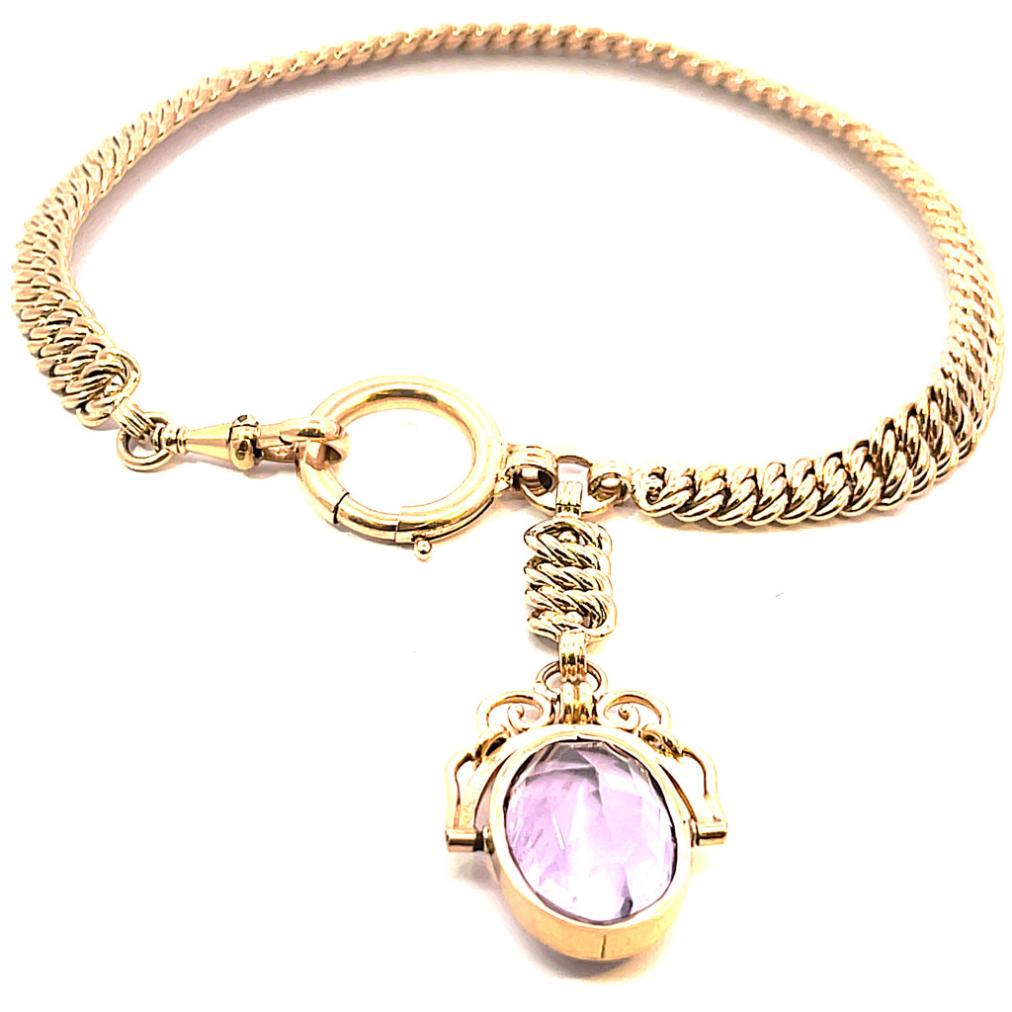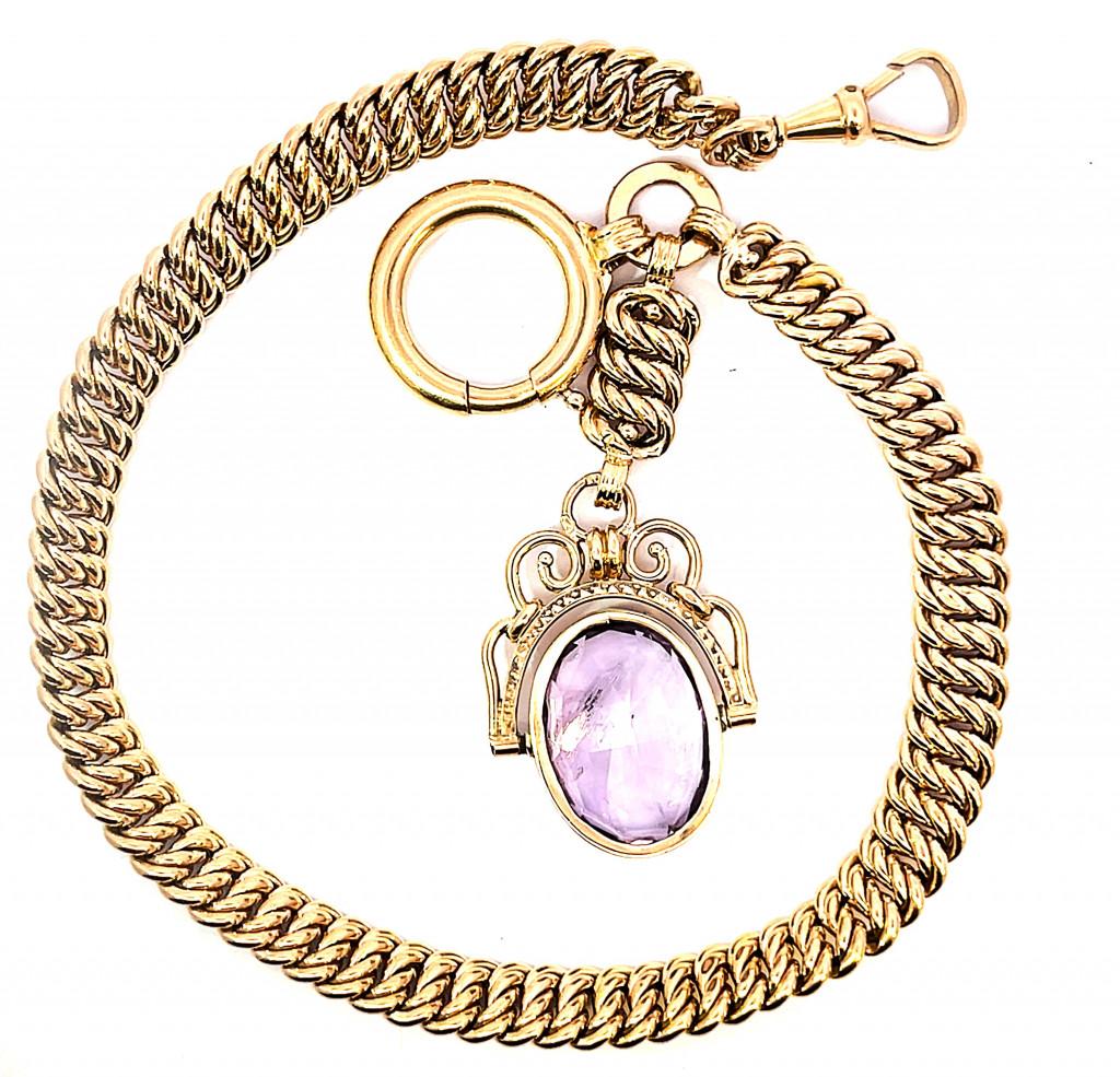 Starožitný zlatý řetízek k hodinkám s přívěsem s ametystem, 29,09 g