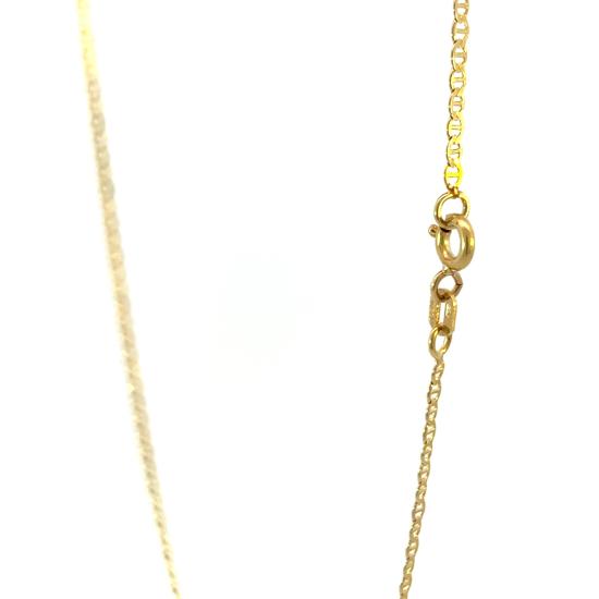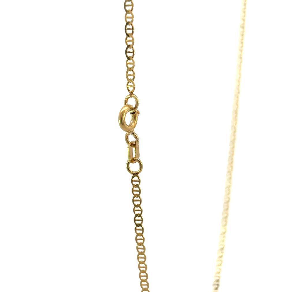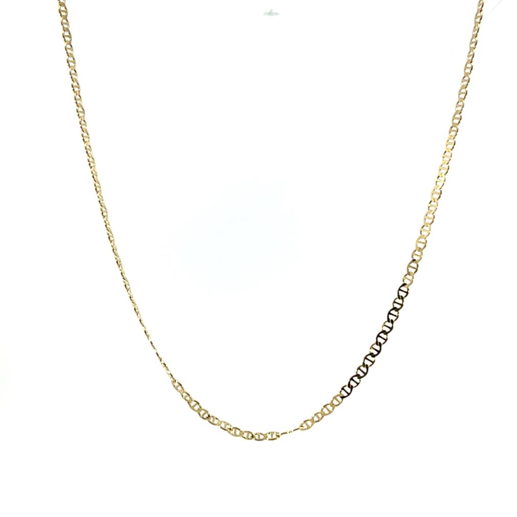 Zlatý řetízek o ryzosti 585/1000, punc labuť. Váha 2,48 g, délka 45,5 cm, v nejširším bodě 2 mm.