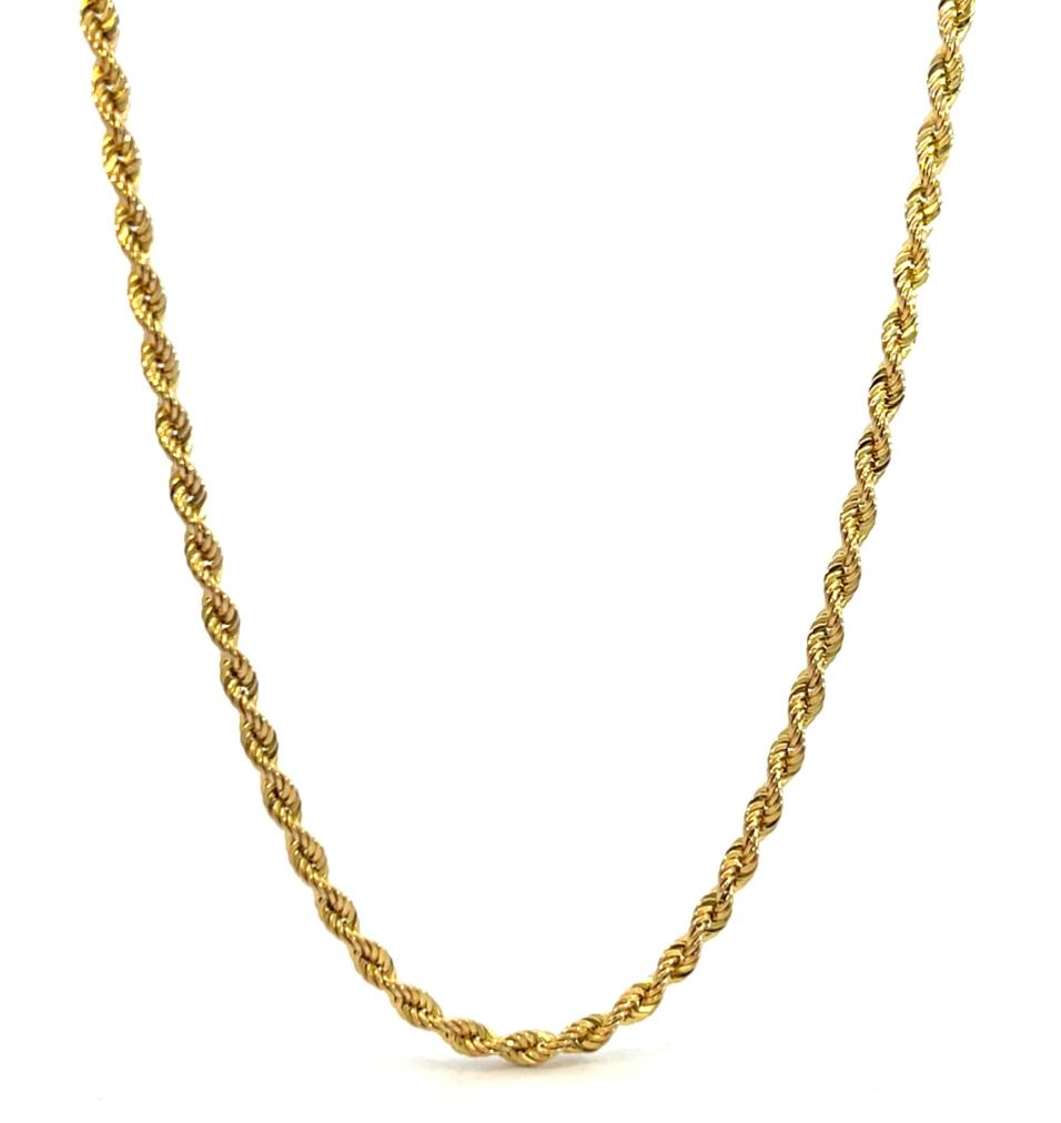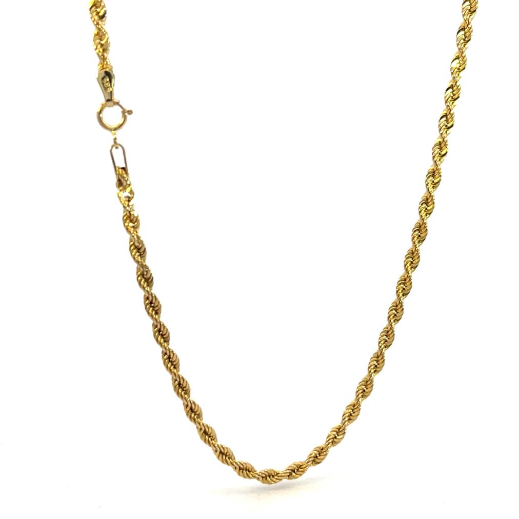 Zlatý řetízek o ryzosti 585/1000, punc labuť. Váha 3,83 g, délka 45,5 cm, v nejširším bodě 2,5 mm.