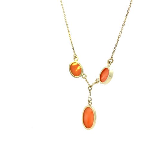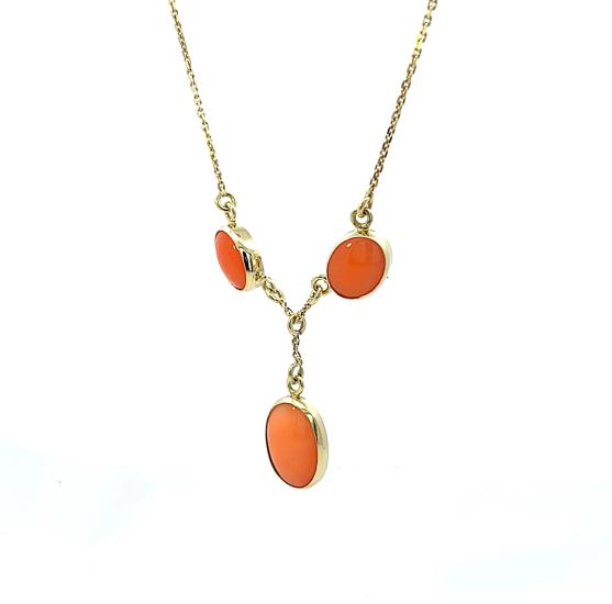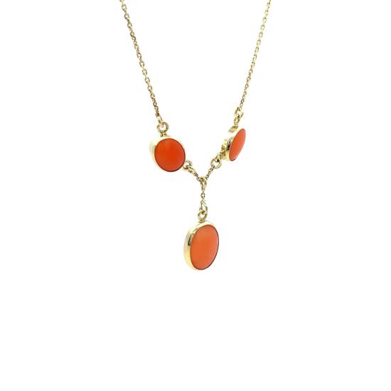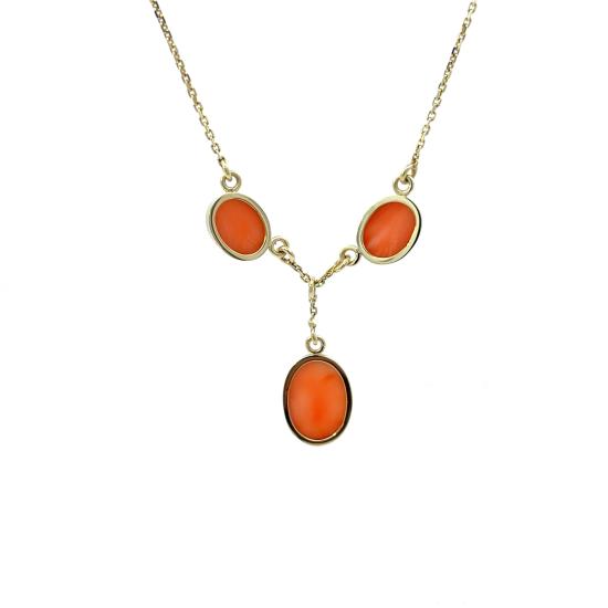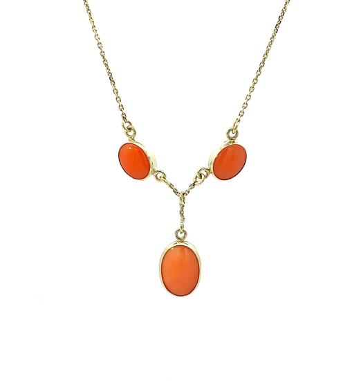 Zlatý kolier o ryzosti 585/1000, punc labuť. Váha 6,14 g, délka řetízku 44,7 cm, šířka řetízku 1 mm, výška přívěsu 27 mm, v nejširším bodě 43 mm. Prostřední korál má světlejší barvu než ostatní dva korály.