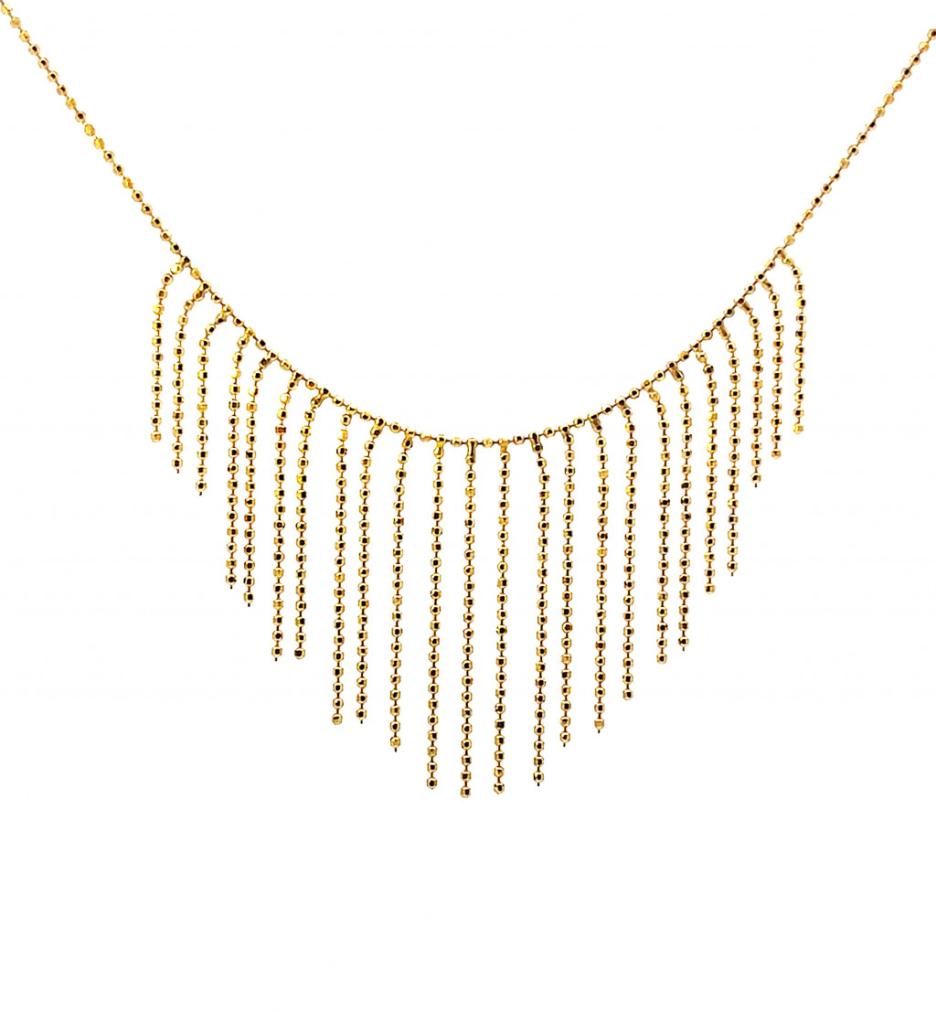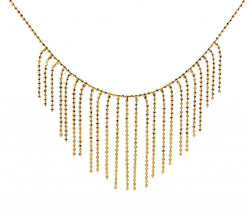 Elegantní ozdobný náhrdelník ze zlata o ryzosti 585/1000 s puncem labuť. Váha 5,38 g, délka 43 cm. Nejdelší proužky na ozdobě měří 32 mm.