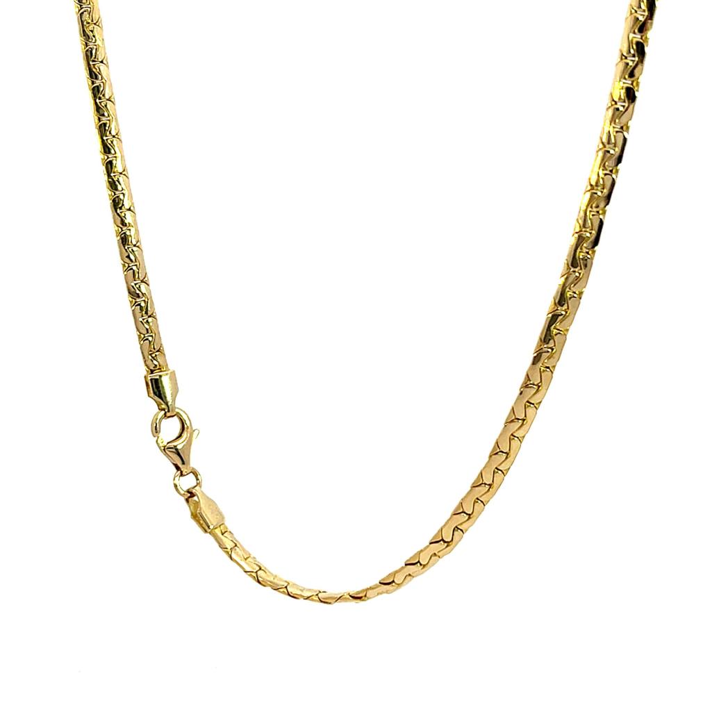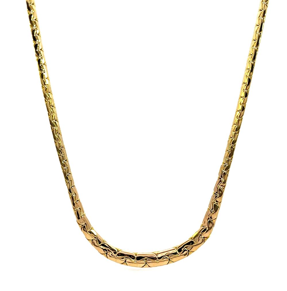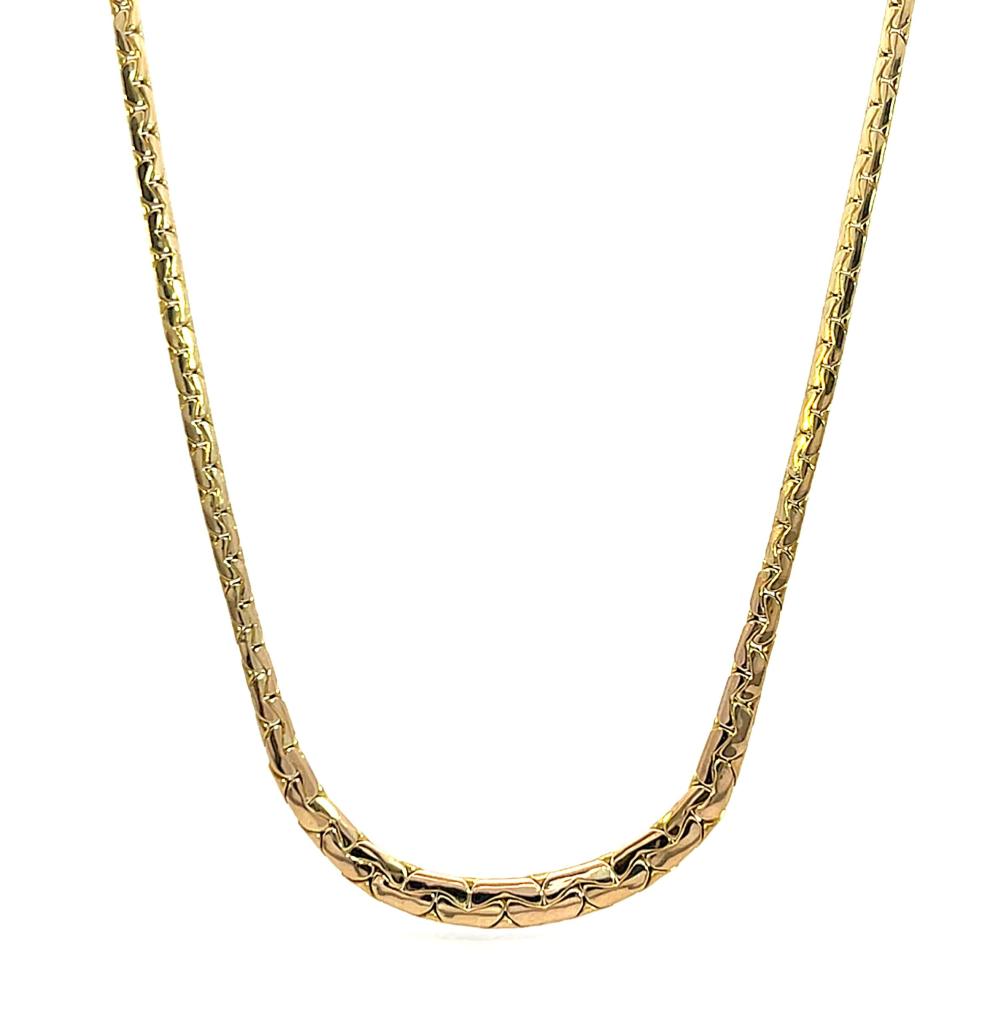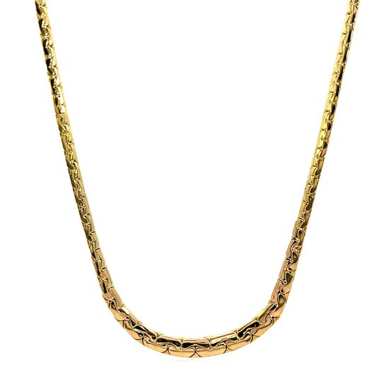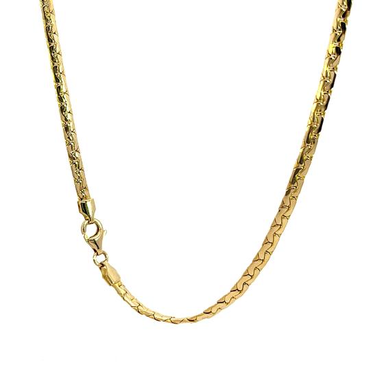 Zlatý náhrdelník o ryzosti 585/1000, punc labuť. Váha 6,97 g, délka 42,2 cm, v nejširším bodě 5 mm.