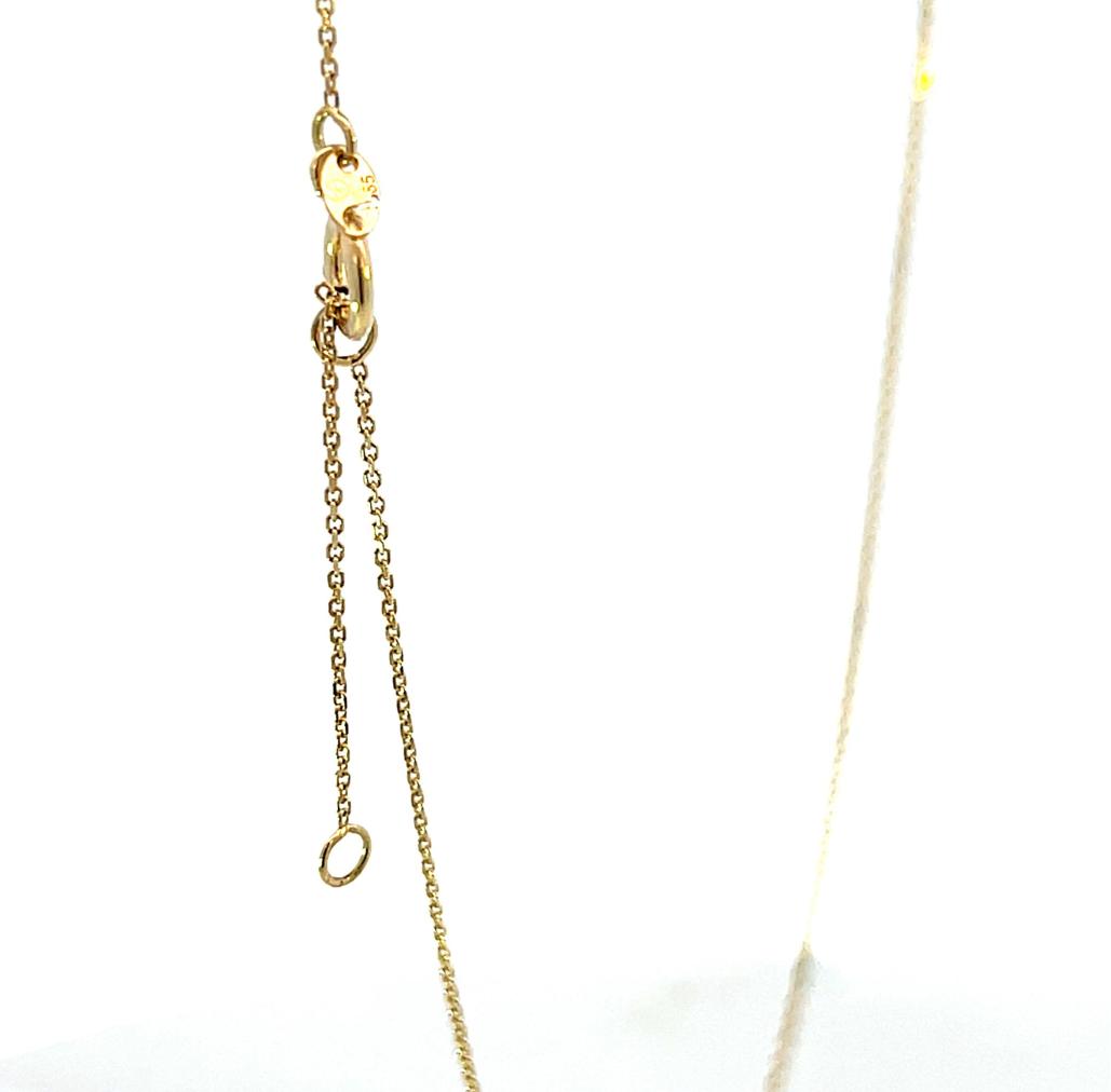Zlatý náhrdelník o ryzosti 585/1000, platný polský punc. Váha 1,72 g, délka je nastavitelná - 43,5 cm nebo 40 cm, šířka řetízku 1 mm, výška přívěsu 7 mm, v nejširším bodě 17,5 mm. Kameny jsou syntetické.