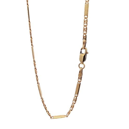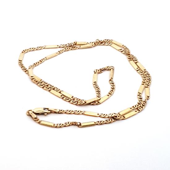 Zlatý řetízek o ryzosti 585/1000, punc labuť. Váha řetízku je 10,59 g, délka 56 cm, v nejširším bodě má 2,5 mm.