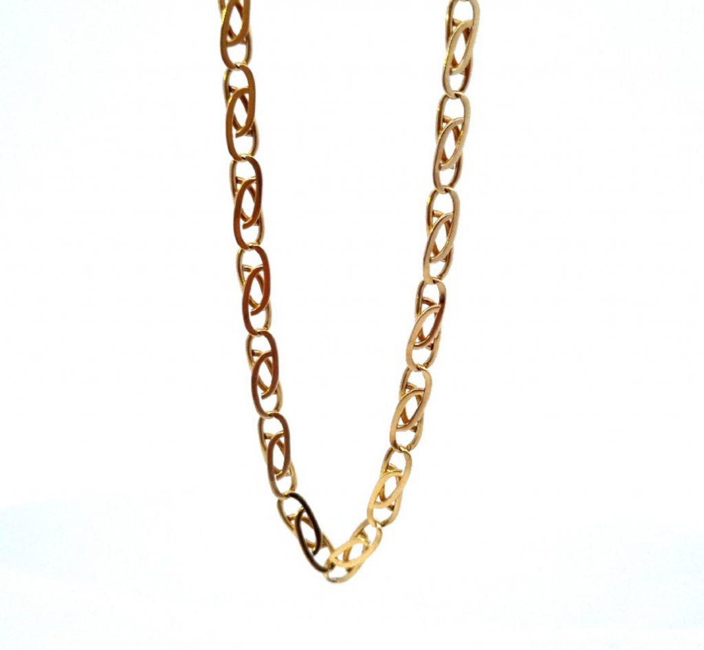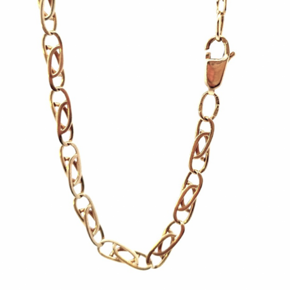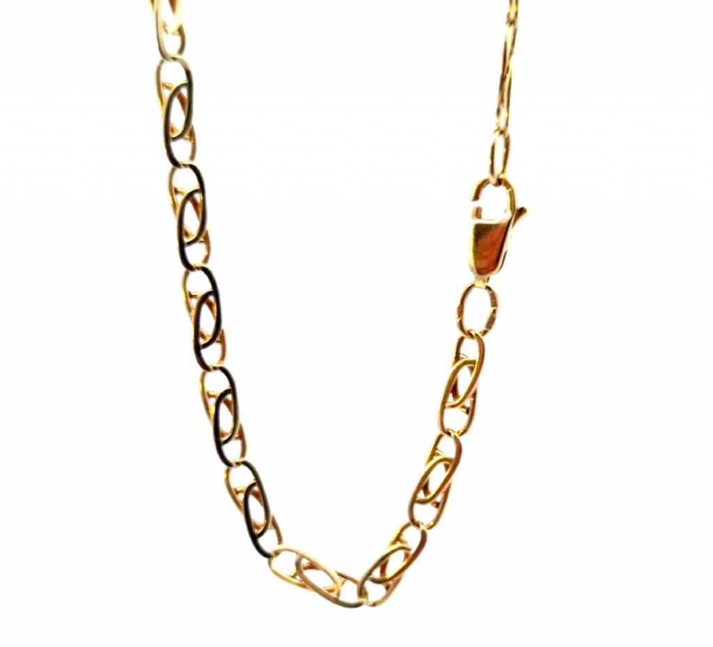 Zlatý řetízek o ryzosti 585/1000, punc labuť. Váha 10,77 g, délka 53 cm, v nejširším bodě 3,5 mm.