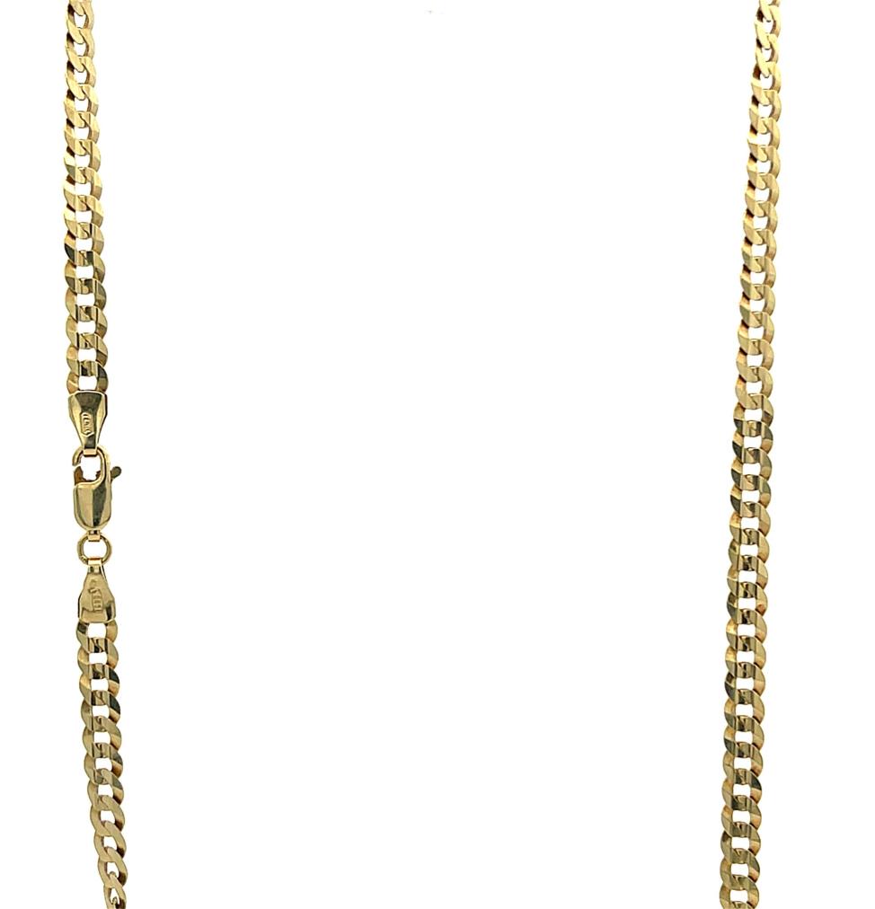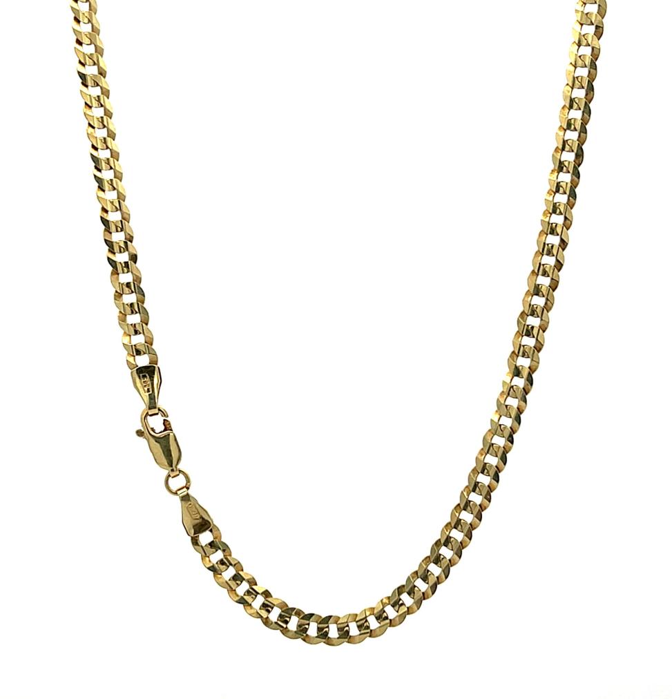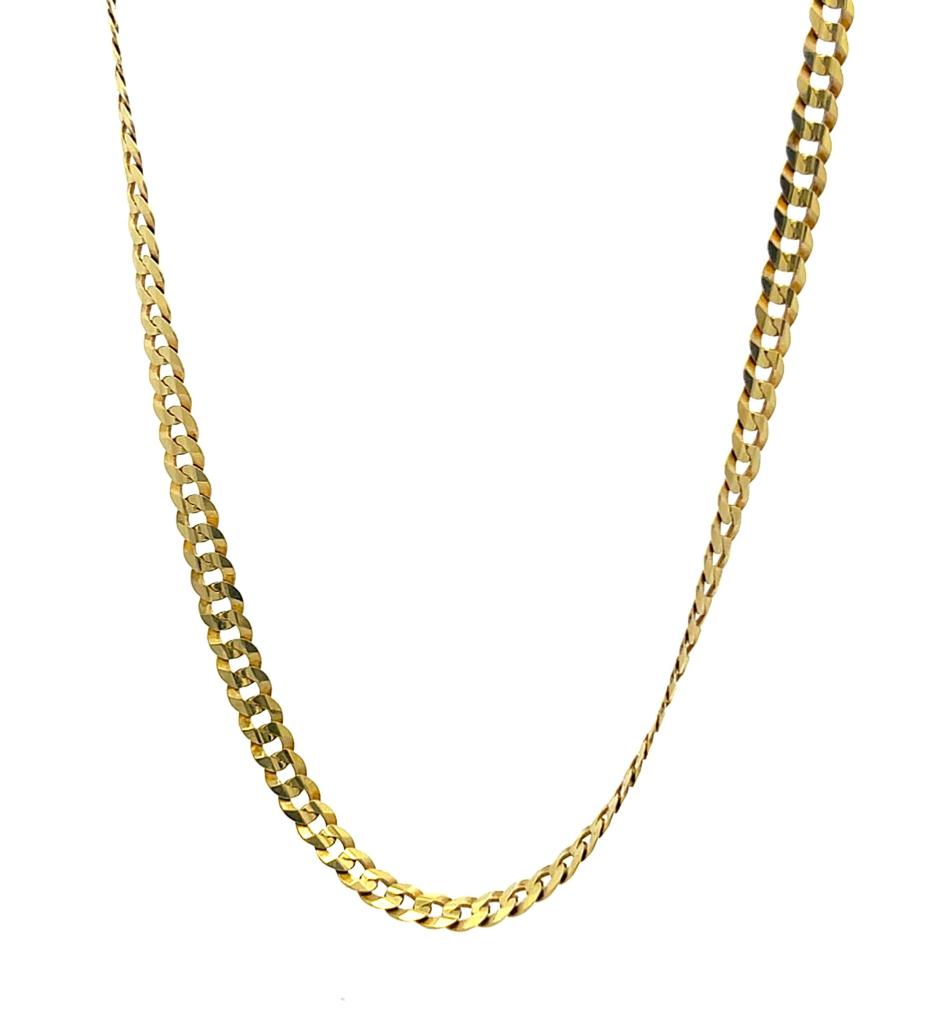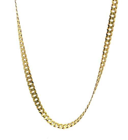 Zlatý řetízek o ryzosti 585/1000, punc labuť. Váha 11,37 g, délka 50,2 cm, v nejširším bodě 4 mm.