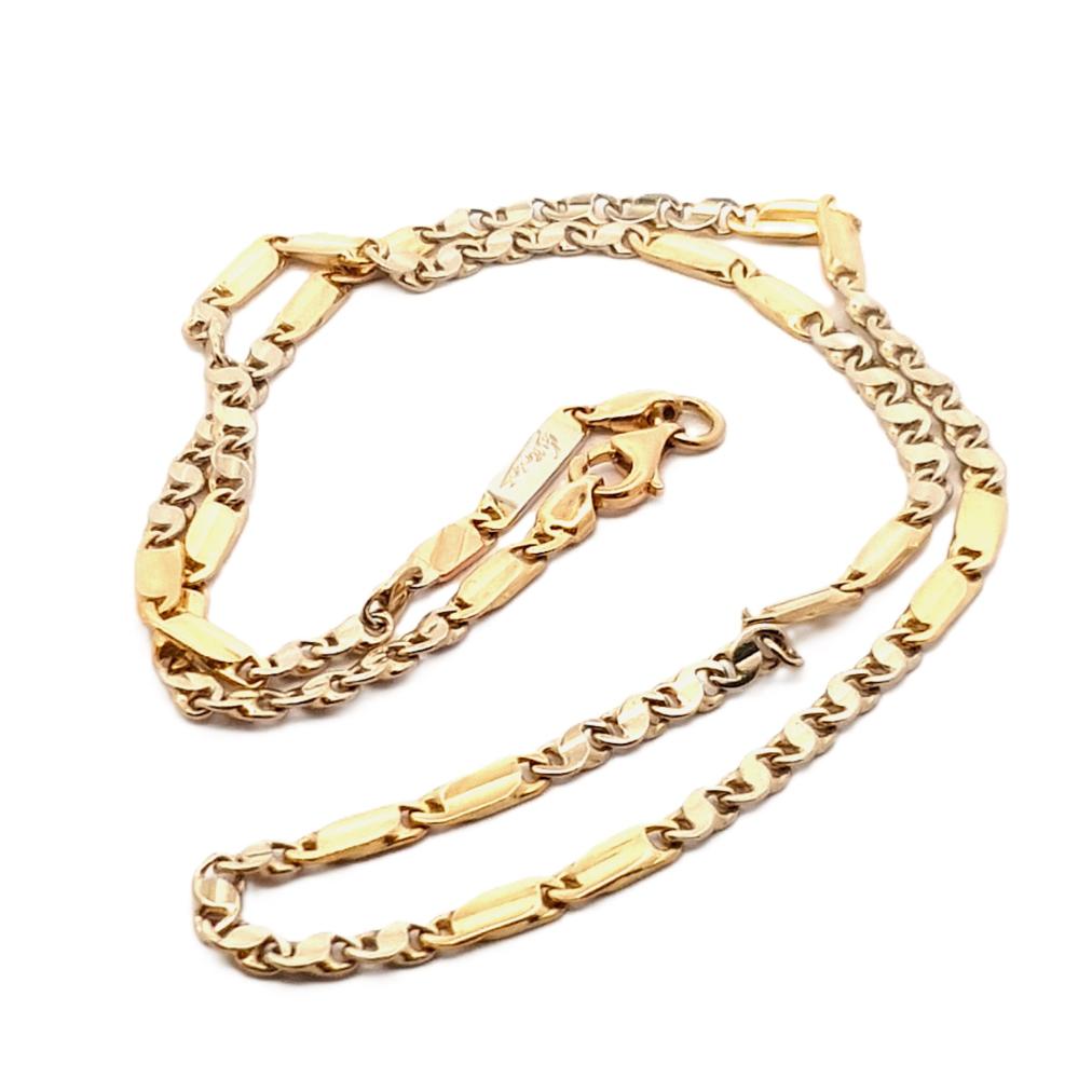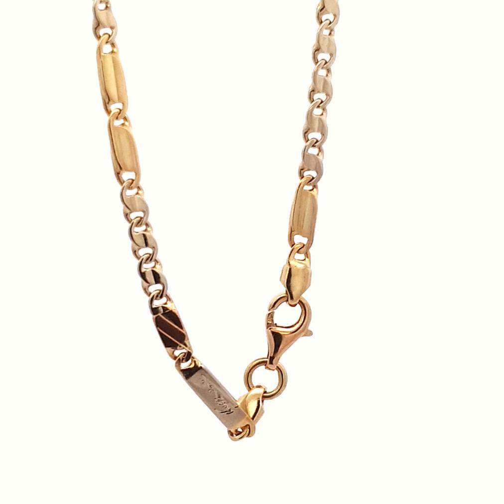 Zlatý řetízek v kombinaci žlutého a růžového zlata o ryzosti 585/1000, punc labuť. Délka řetízku je 51 cm, v nejširším bodě 3,5 mm, váha 19,09 g.
