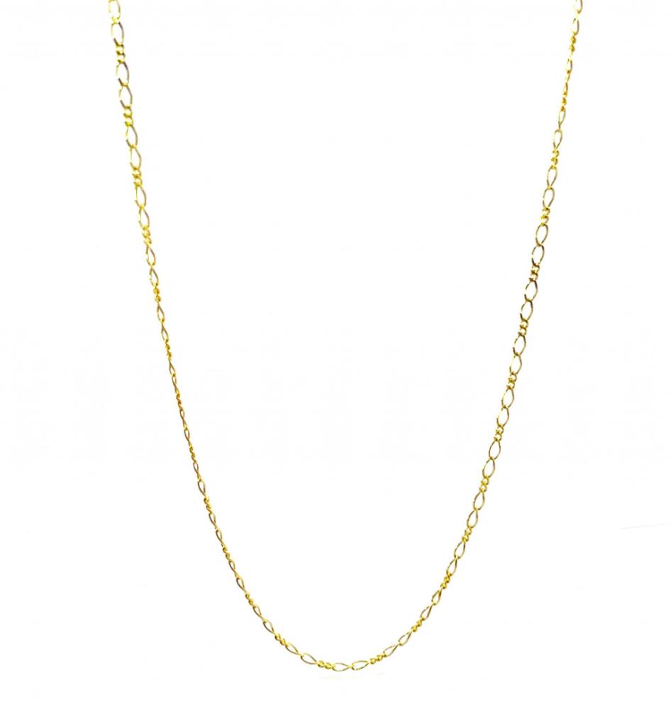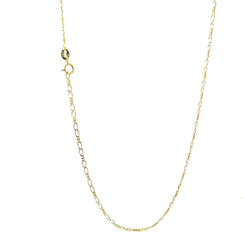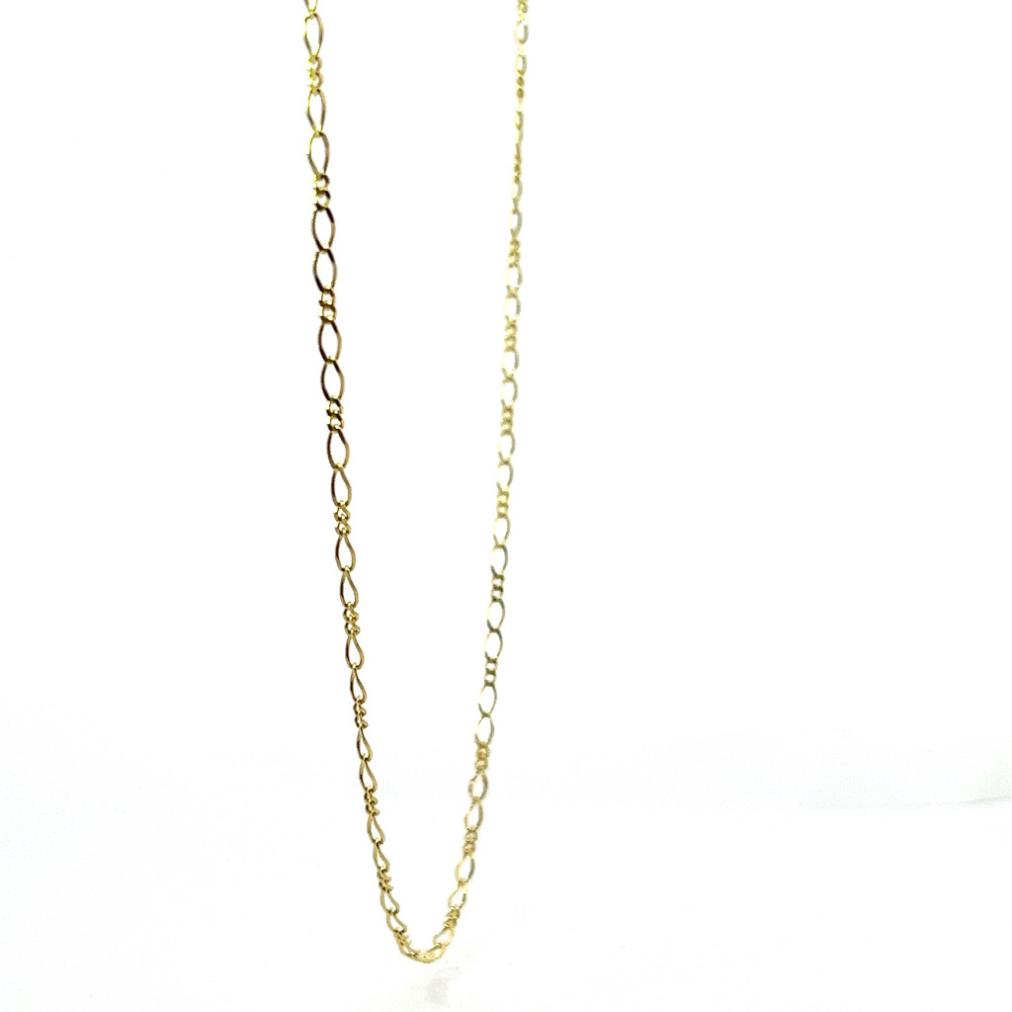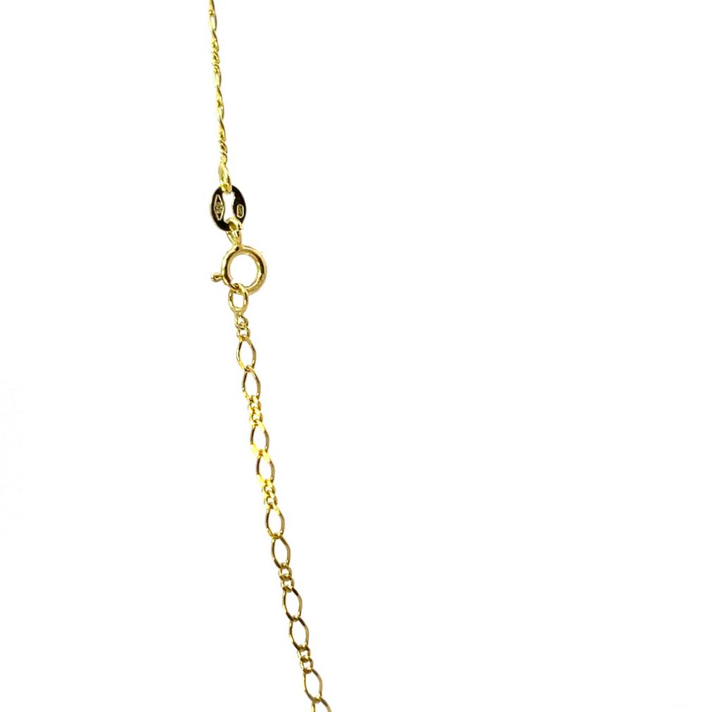 Jemný řetízek ze zlata o ryzosti 585/1000 s puncem labuť. Váha 2,38 g, délka 54,5 cm, šířka větších oček je 2 mm, šířka menších oček je 1 mm.