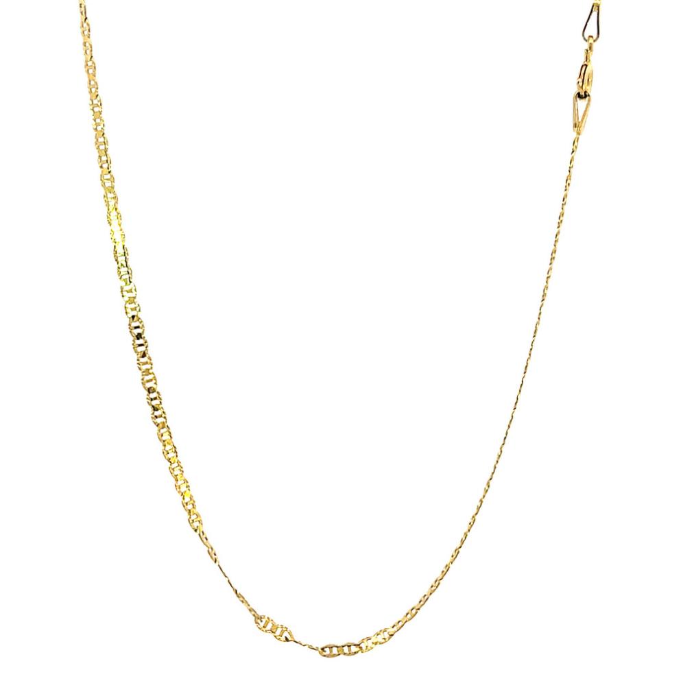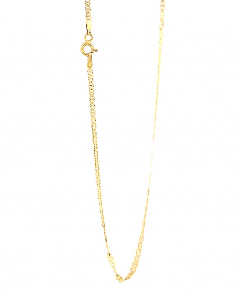 Zlatý řetízek o ryzosti 585/1000, punc labuť. Váha 2,50 g, délka 44,8 cm, v nejširším bodě 2 mm.