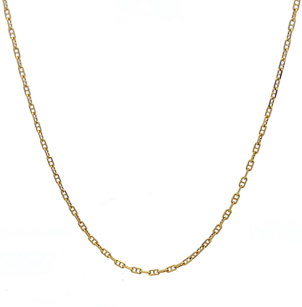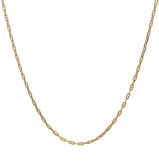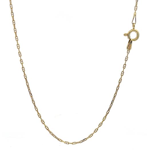 Zlatý řetízek o ryzosti 585/1000, punc labuť. Váha 2,65 g, délka 53 cm, v nejširším bodě 1,5 mm.