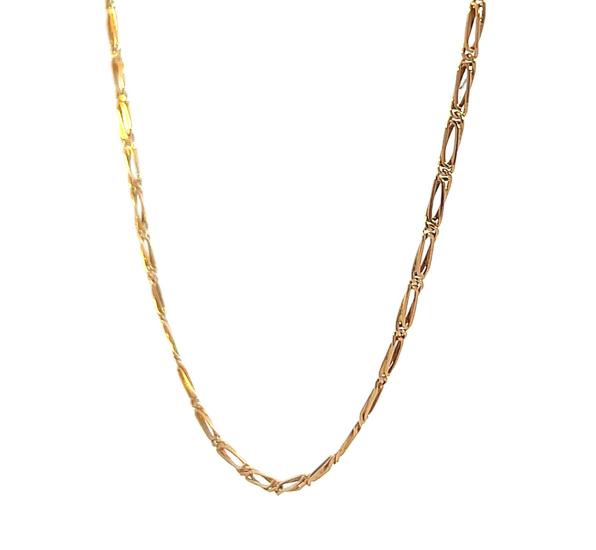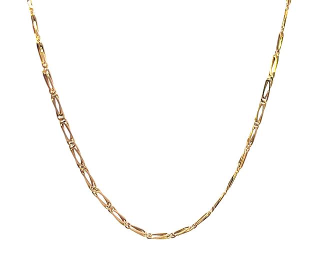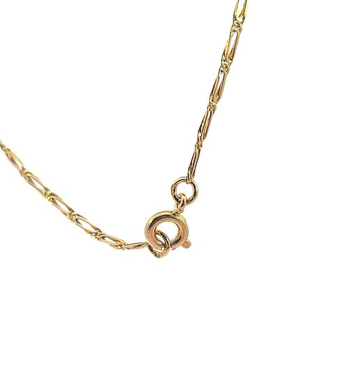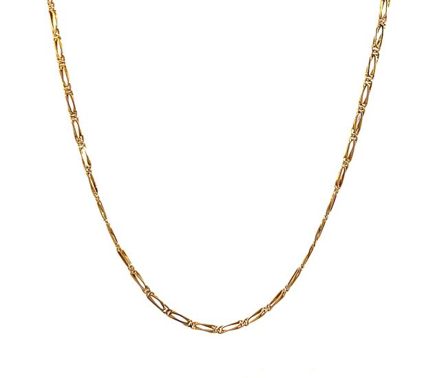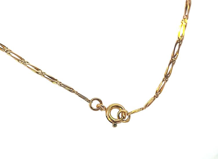 Řetízek z růžového zlata o ryzosti 585/1000, punc čejka. Váha 2,88 g, délka 45 cm, v nejširším bodě 1,5 mm.