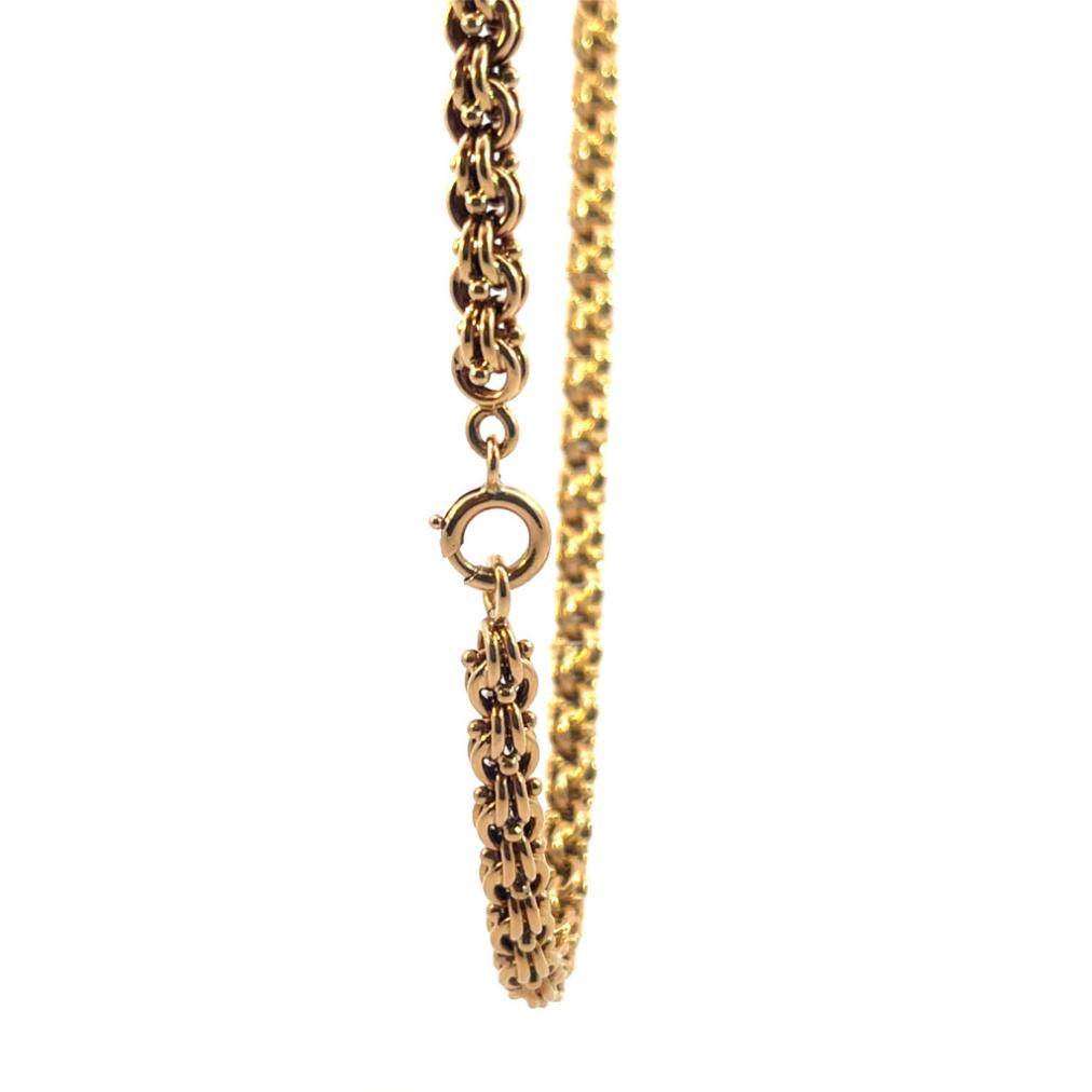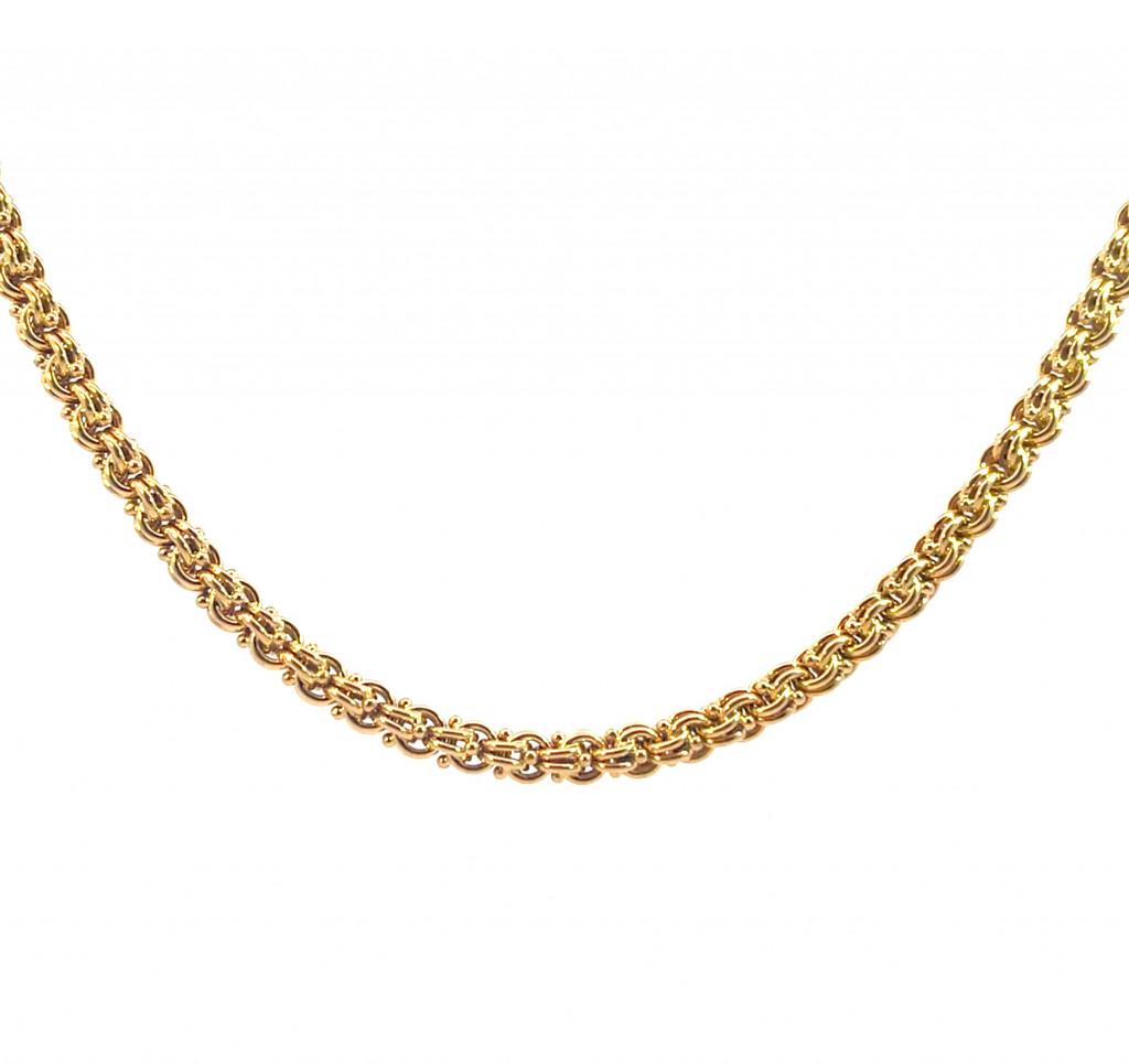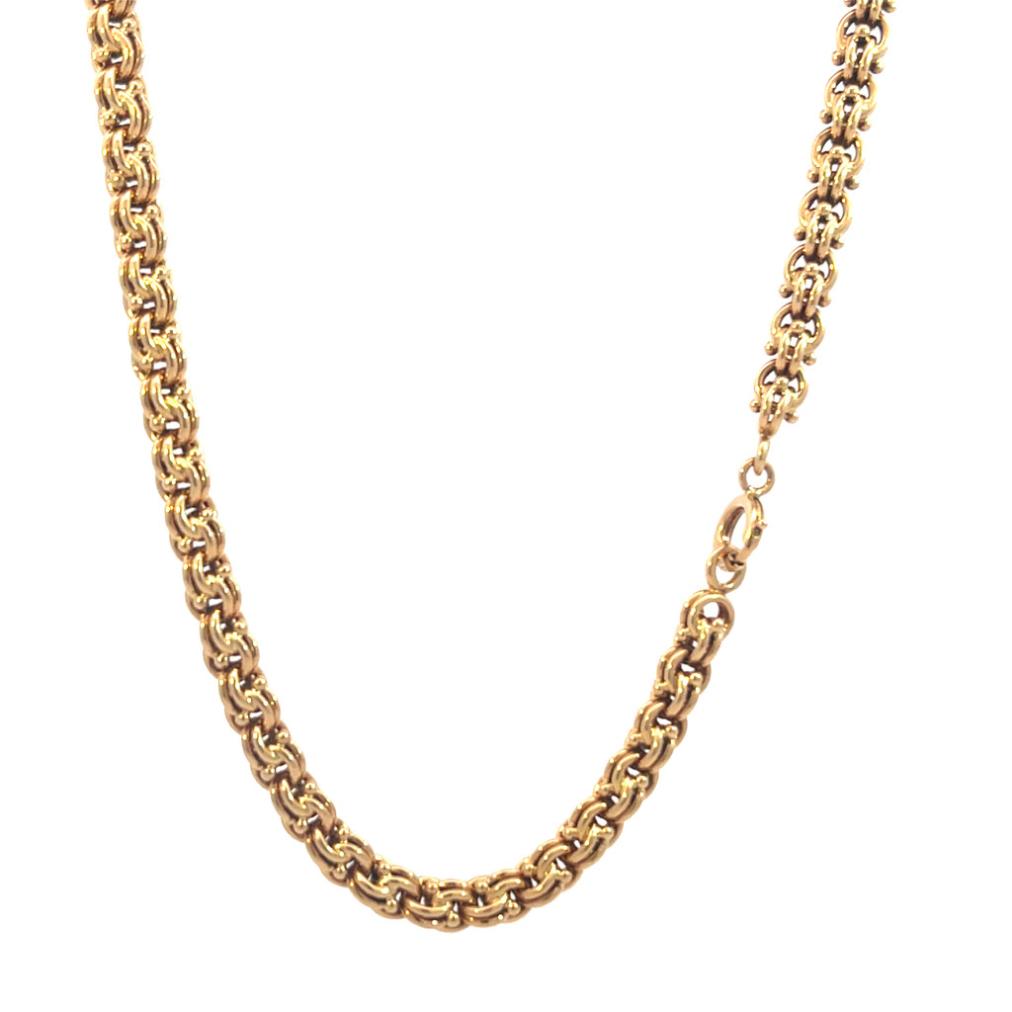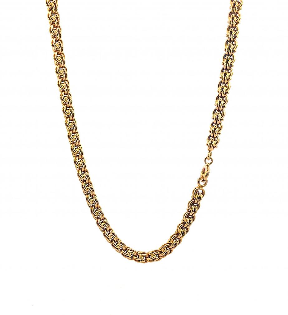 Zlatý řetízek o ryzosti 585/1000, punc labuť. Váha 29,70 g, délka 61 cm, šířka 4 mm.