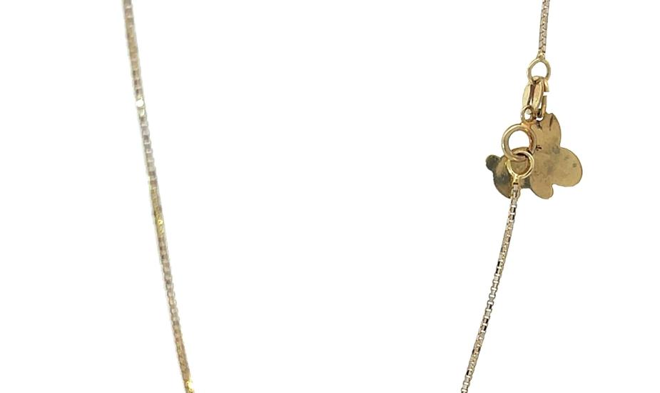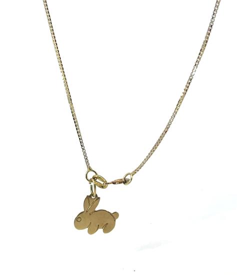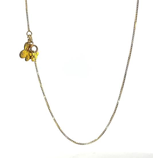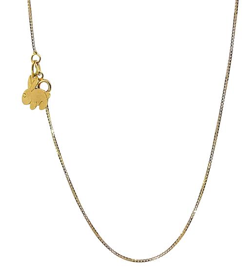 Řetízek z kombinace žlutého a bílého zlata o ryzosti 585/1000, punc labuť. Váha 3,04 g, délka 55 cm, v nejširším bodě 1 mm. Řetízek má u zapínání přívěs ve tvaru králíka, viz. foto.