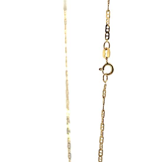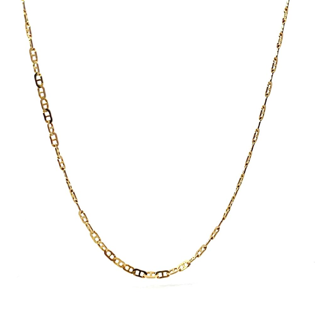 Zlatý řetízek o ryzosti 585/1000, punc labuť. Váha 3,15 g, délka 54,4 cm, v nejširším bodě 2 mm.