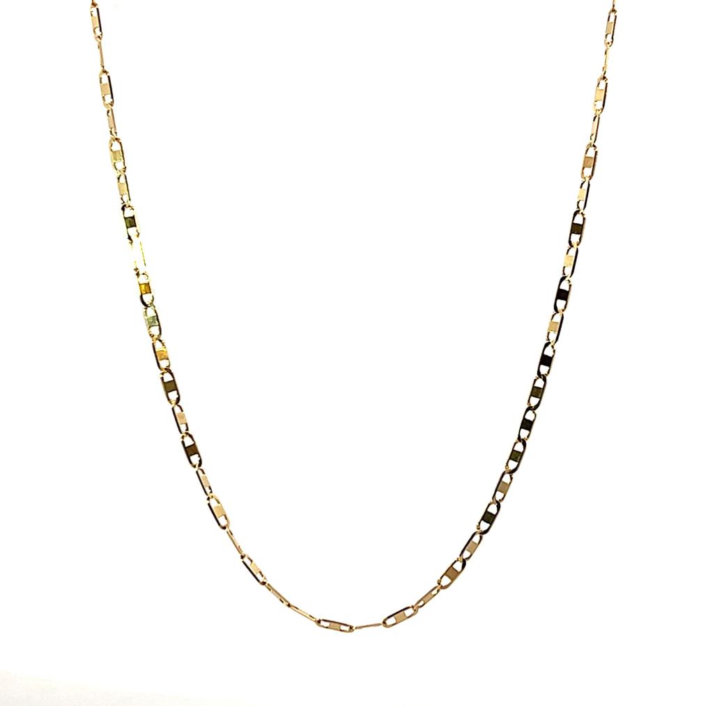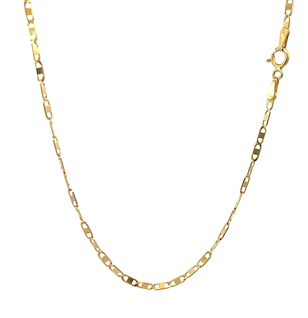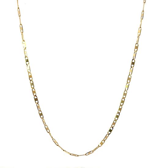Zlatý řetízek o ryzosti 585/1000, punc labuť. Váha 3,19 g, délka 54,5 cm, v nejširším bodě 2 mm.