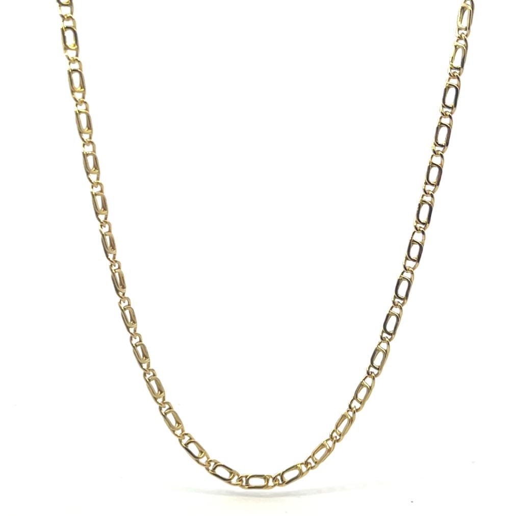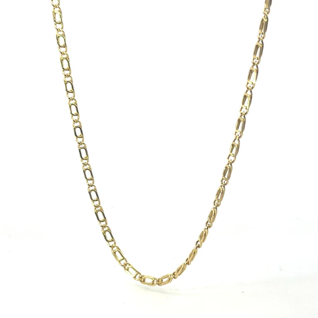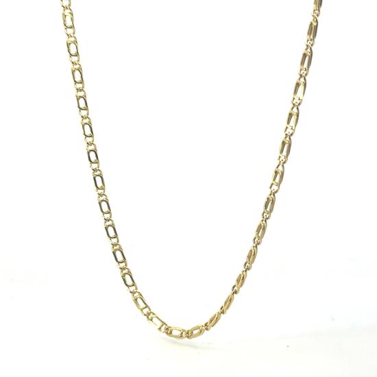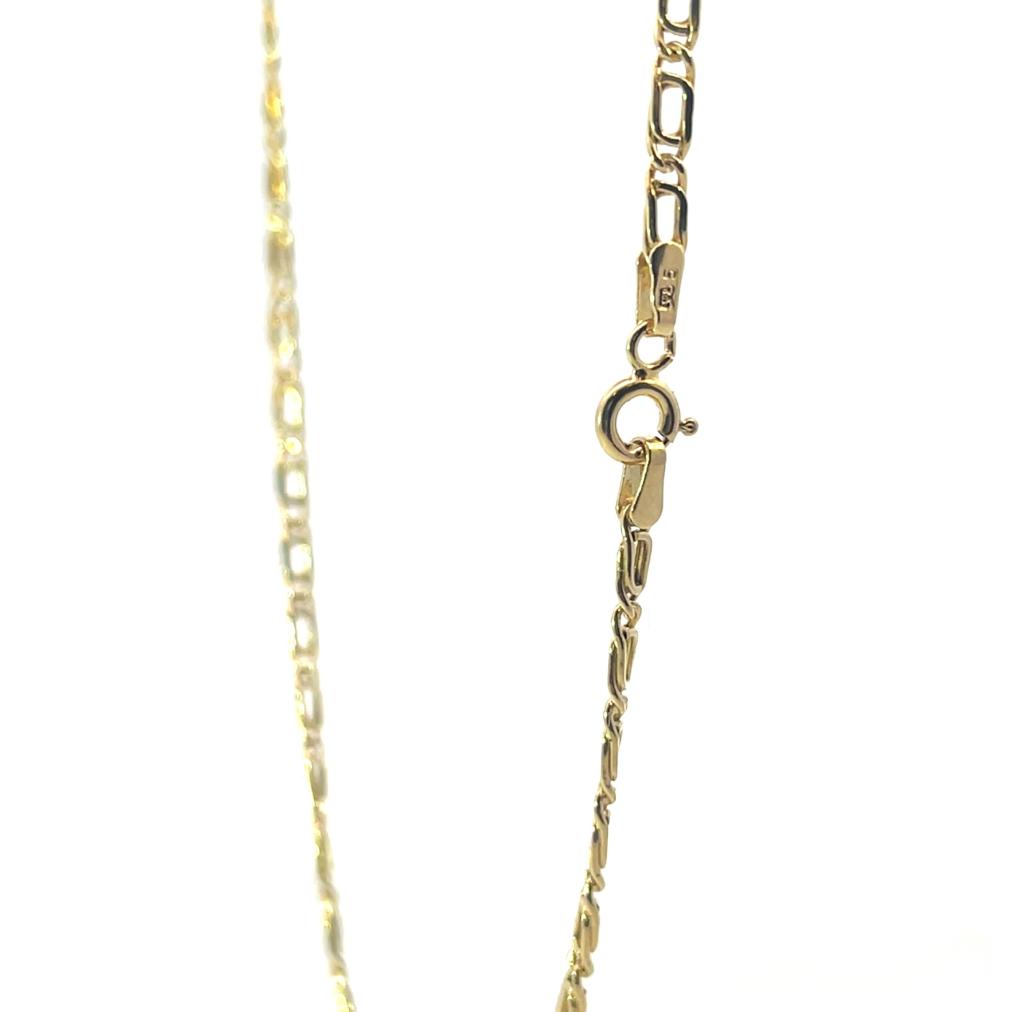 Zlatý řetízek o ryzosti 585/1000, punc labuť. Váha 3,50 g, délka 51 cm, v nejširším bodě 2,5 mm.