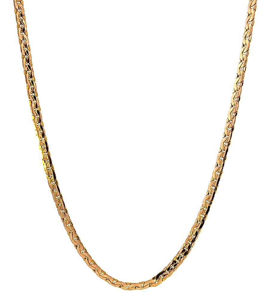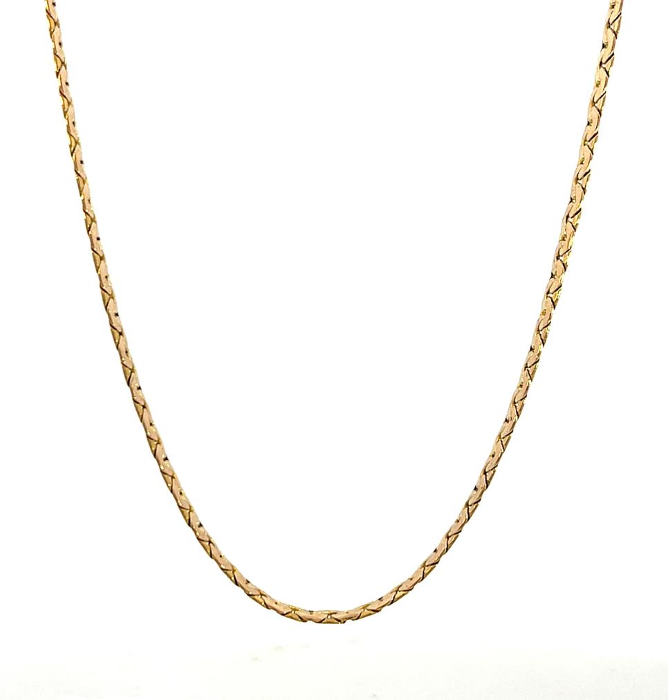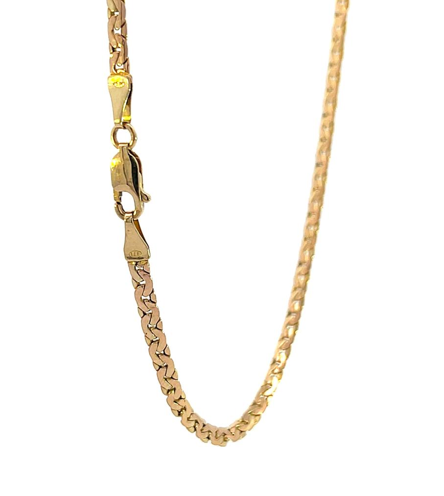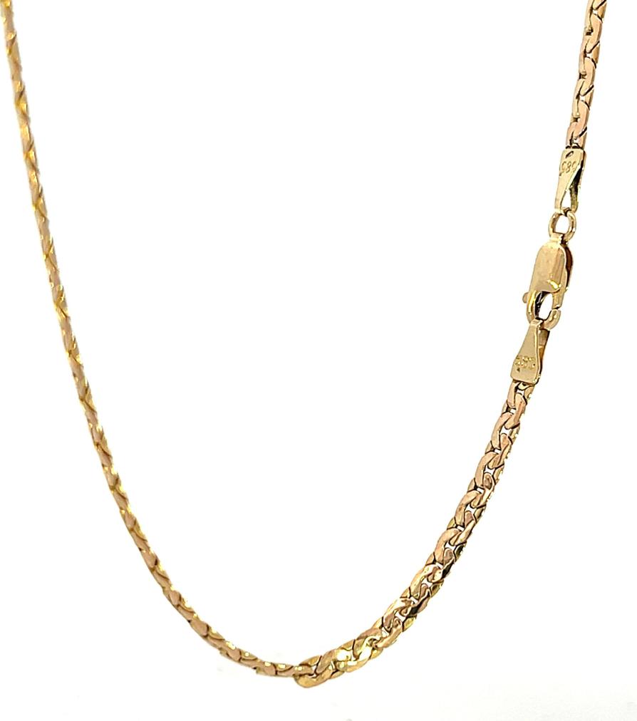 Zlatý řetízek o ryzosti 585/1000, punc labuť. Váha 4,40 g, délka 46,5 cm, v nejširším bodě 3 mm.