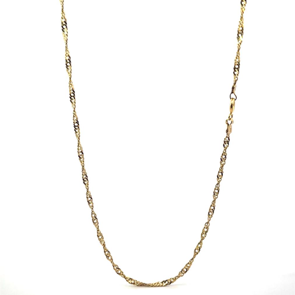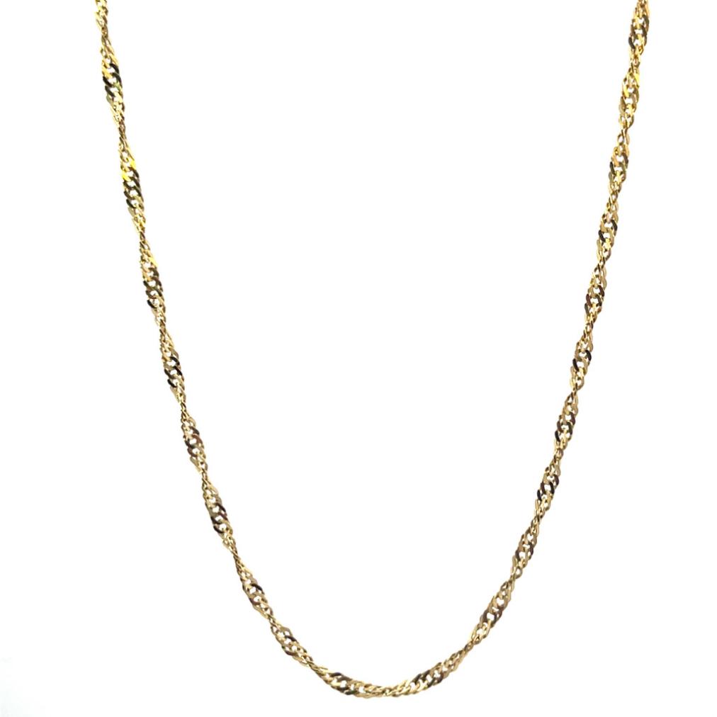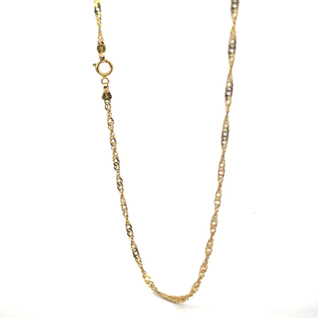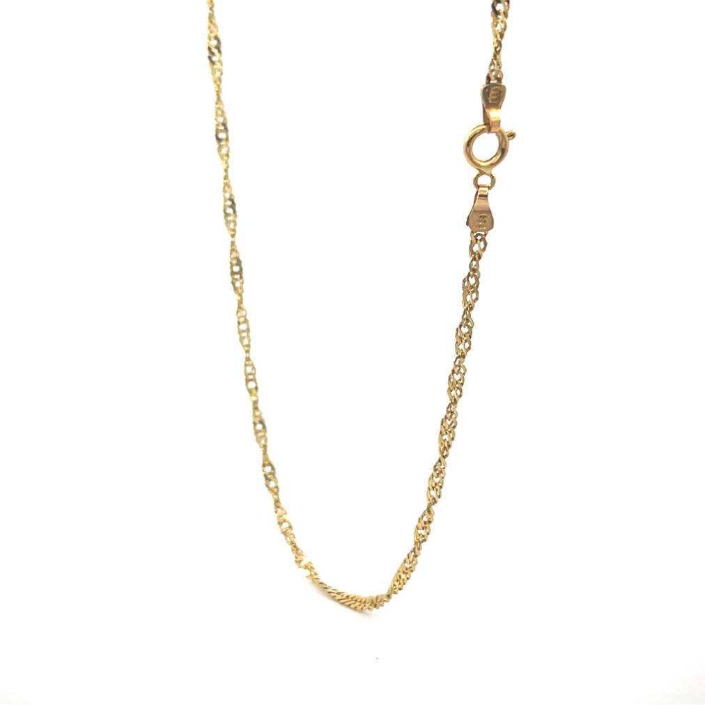 Zlatý řetízek o ryzosti 585/1000, punc labuť. Váha 5,02 g, délka 51 cm, v nejširším bodě 2 mm.