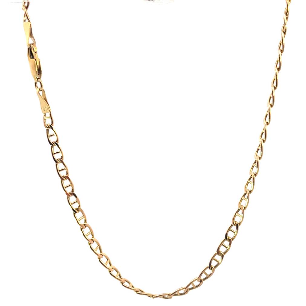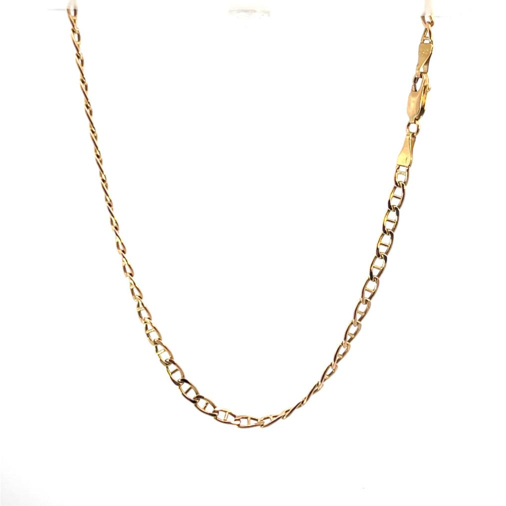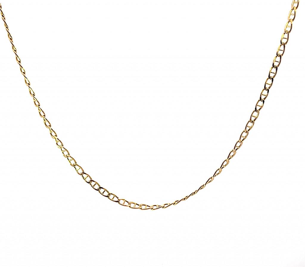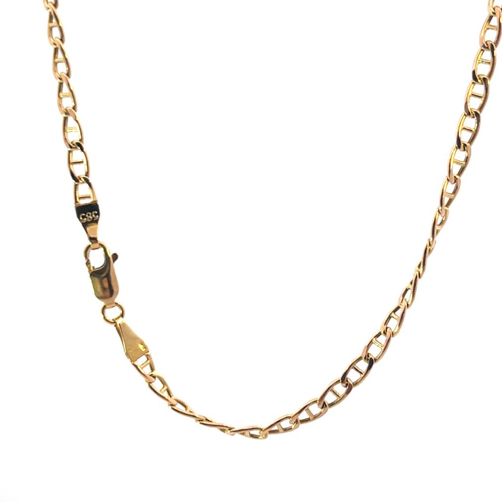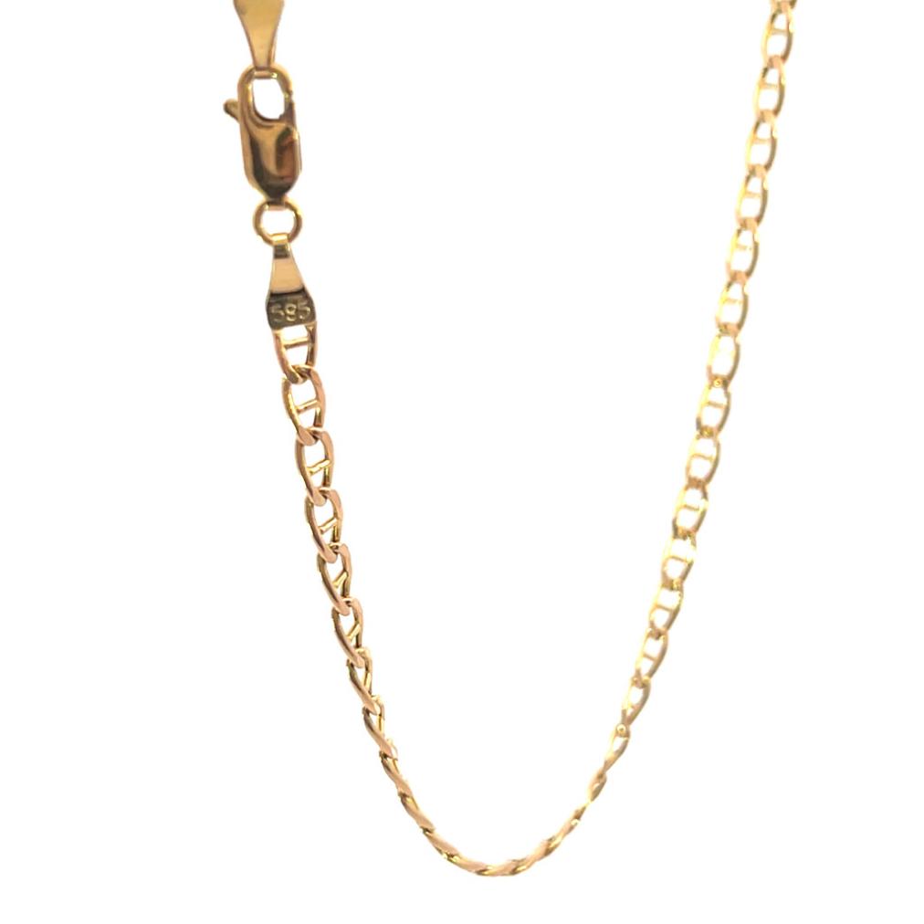 Zlatý řetízek - růžový o ryzosti 585/1000, punc labuť. Váha 5,39 g, délka 50,5 cm, šířka 3 mm.