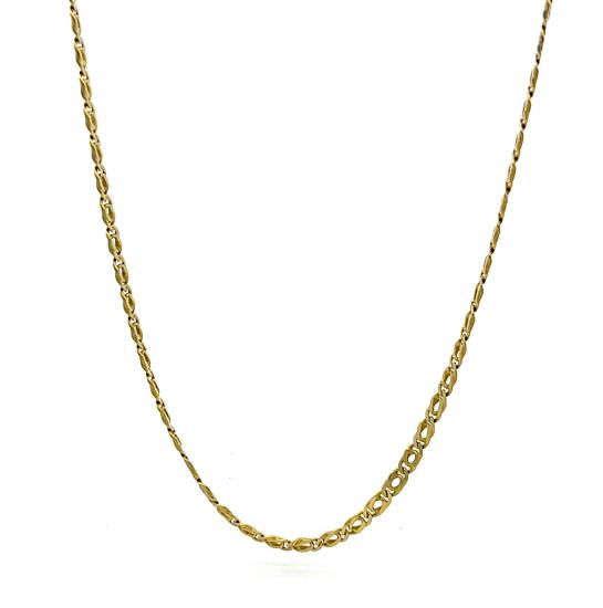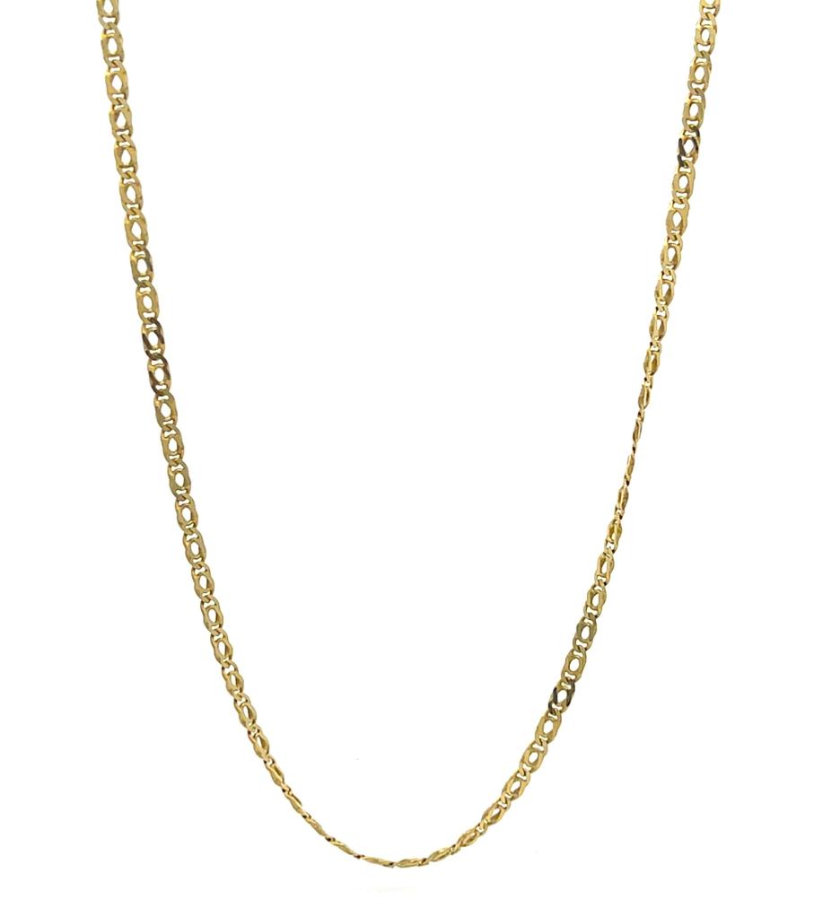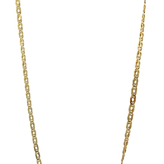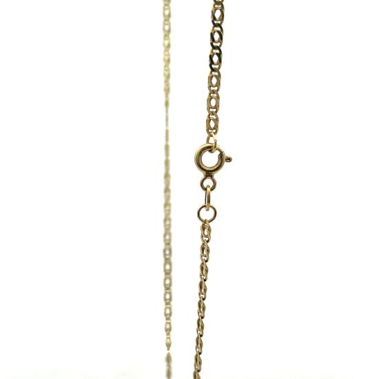 Zlatý řetízek o ryzosti 585/1000, punc labuť. Váha 5,69 g, délka 50 cm, v nejširším bodě 2,5 mm.