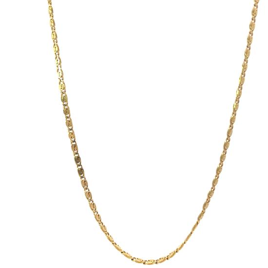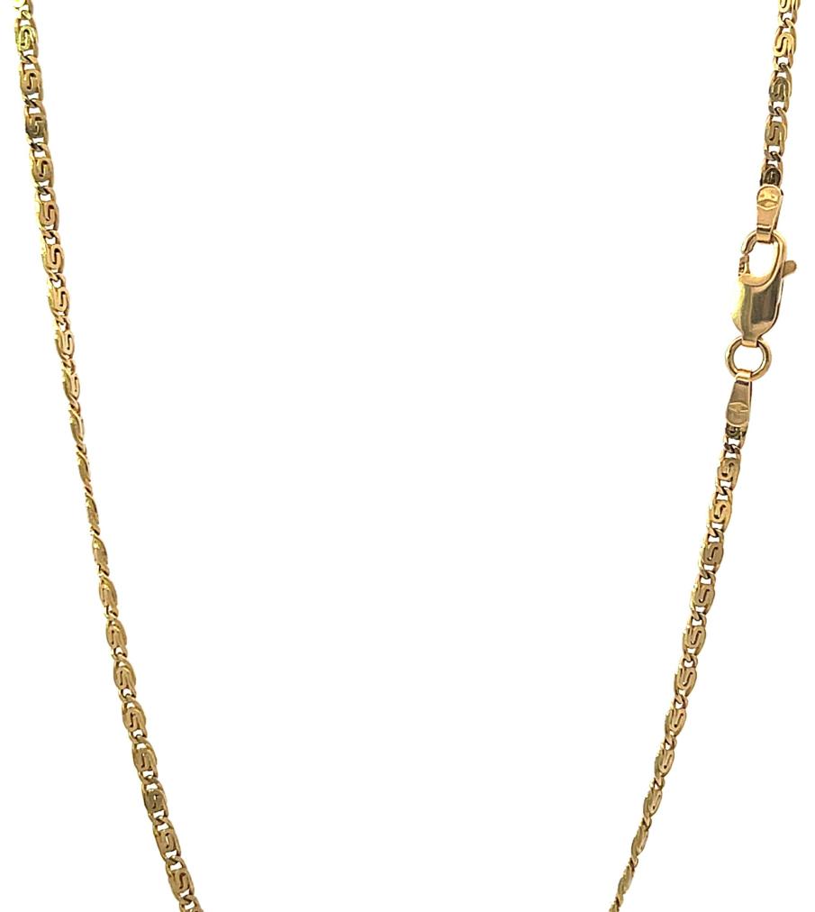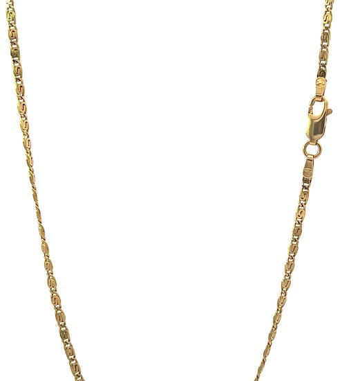Zlatý řetízek o ryzosti 585/1000, punc labuť. Váha 5,88 g, délka 44,6 cm, v nejširším bodě 2 mm.