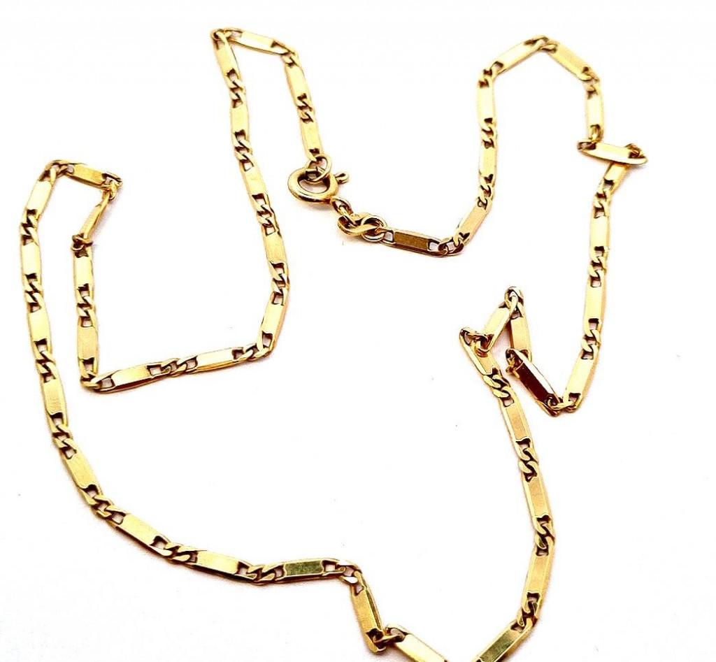 Zlatý řetízek ze žlutého zlata, váha 6,05 g, ryzost 585/1000, punc labuť. Délka 42 cm, šířka 2 mm.