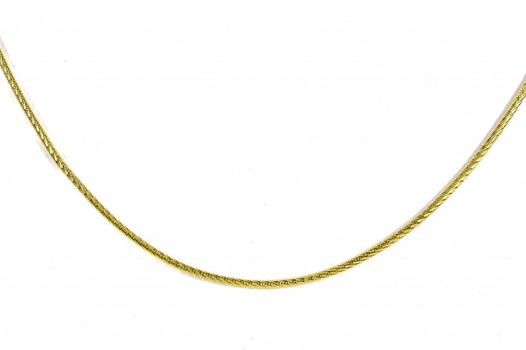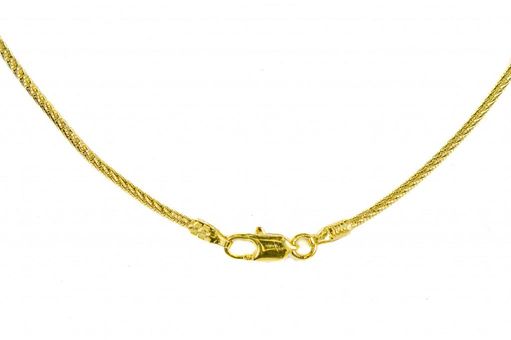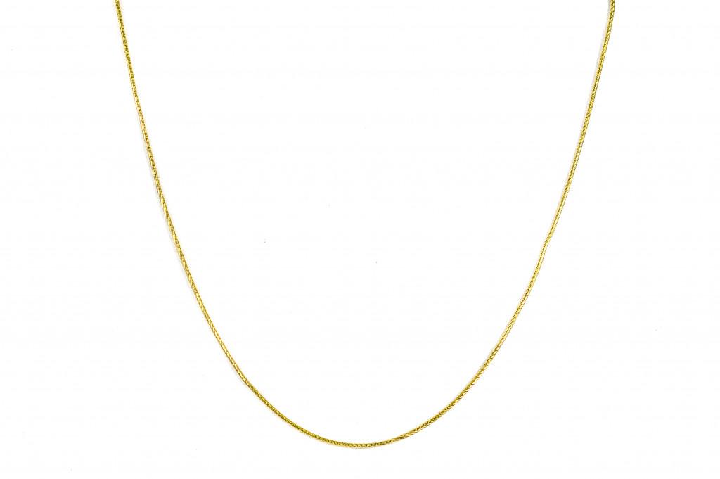 Zlatý řetízek o ryzosti 585/1000, punc labuť. Váha 7,37 g, délka 46,5, šířka 1 mm.