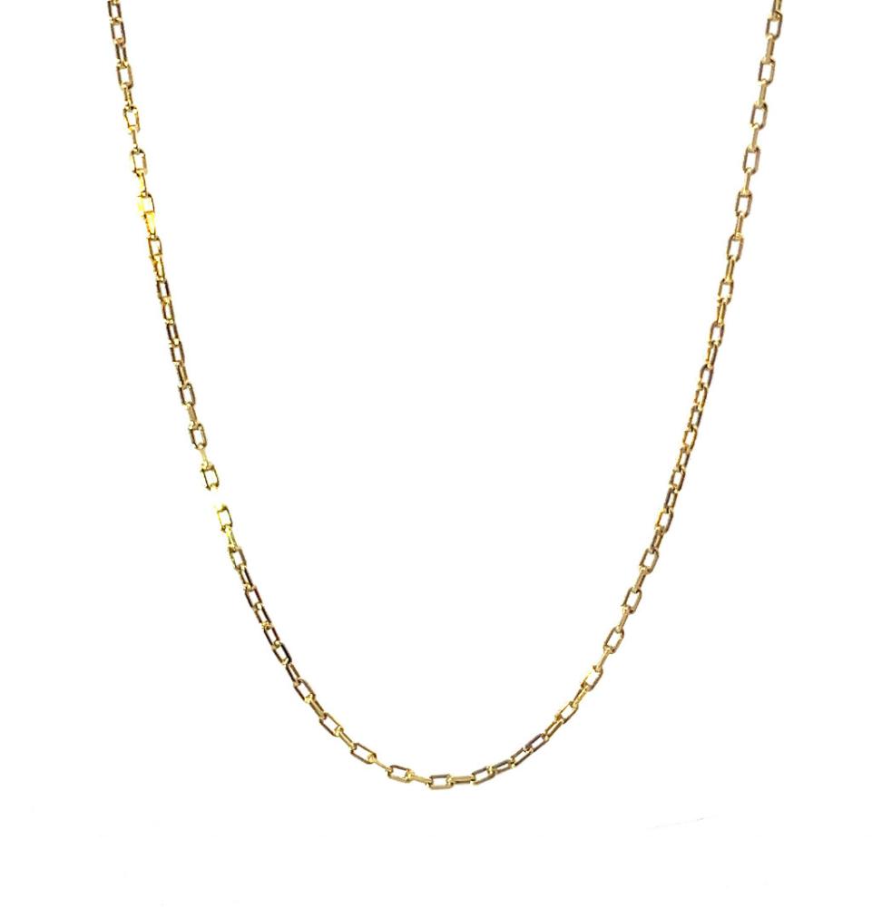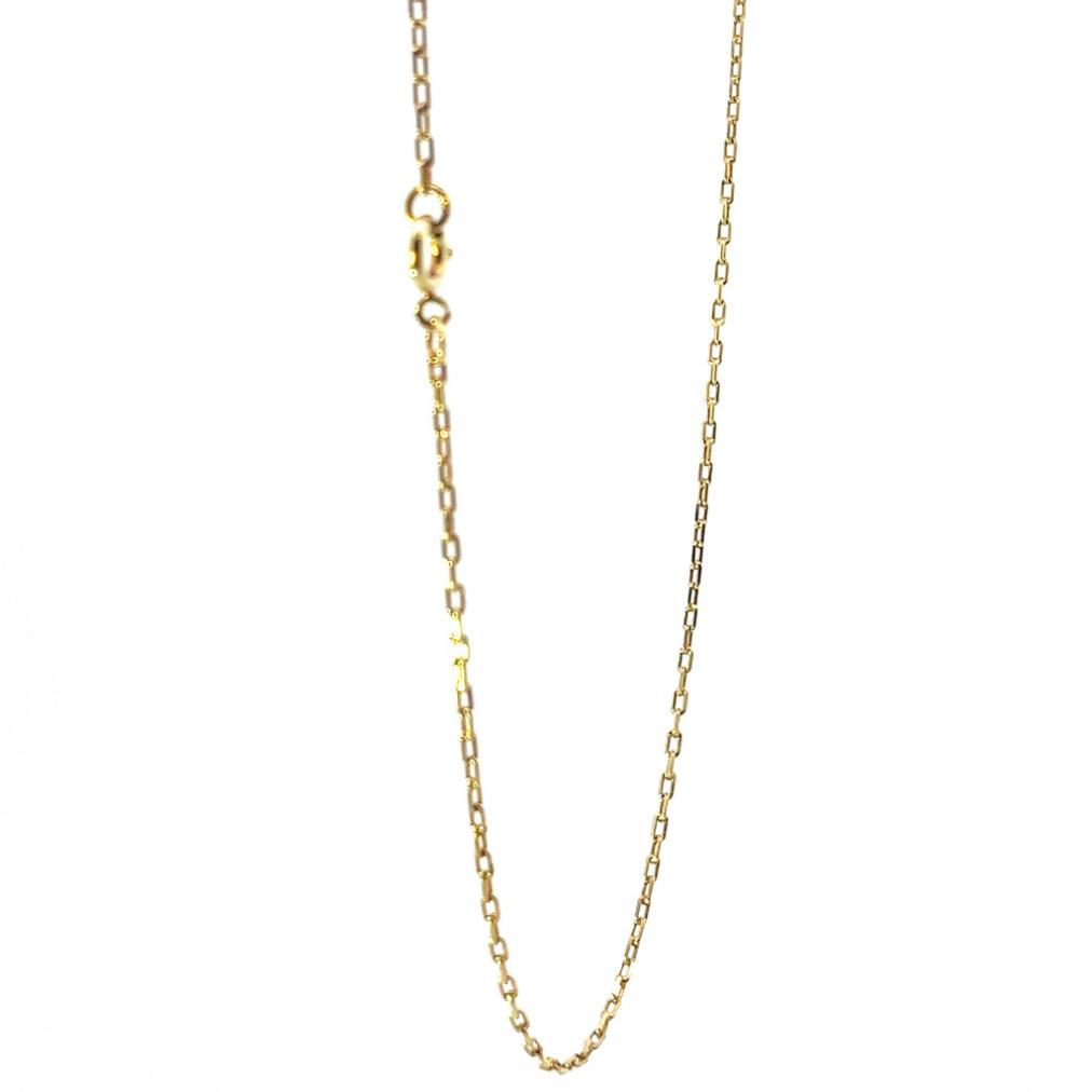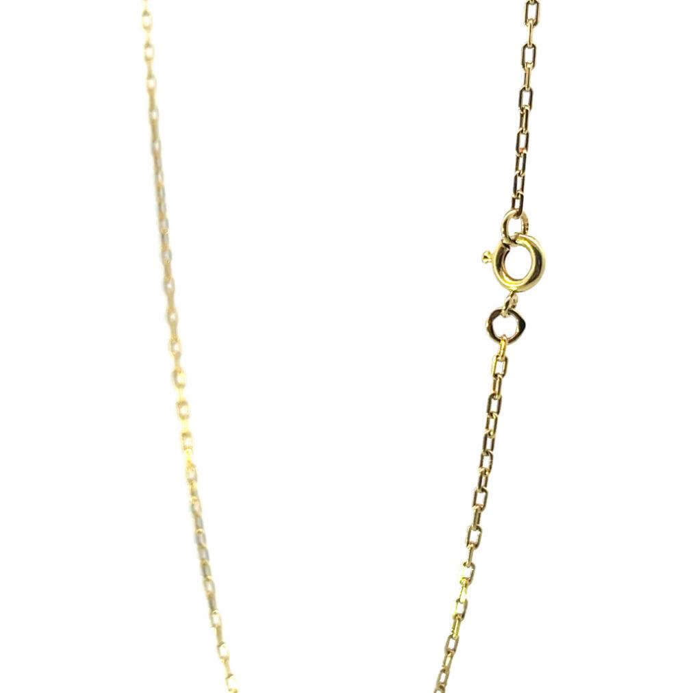 Zlatý řetízek s pilovanými očky o ryzosti 585/1000 s puncem čejka. Váha 3,68 g, délka 46,5 cm. Šířka oček 1,5 mm.