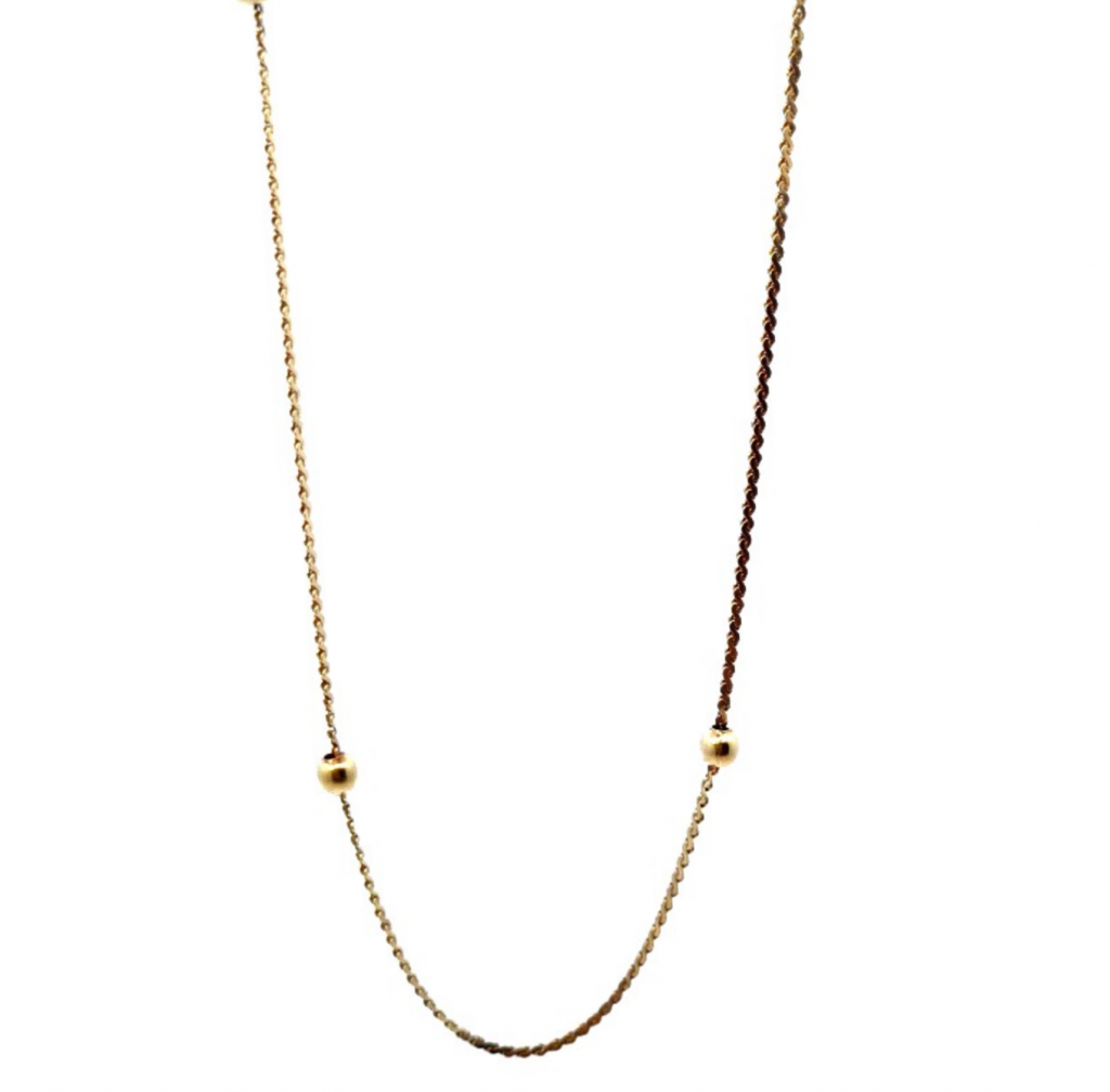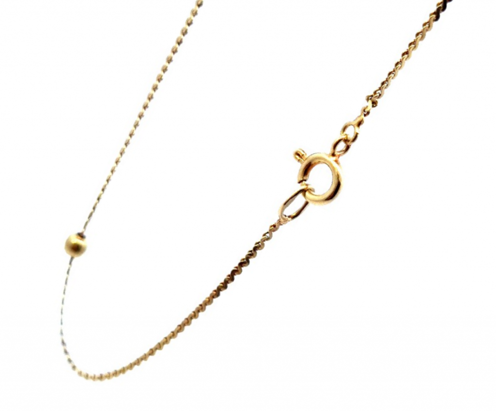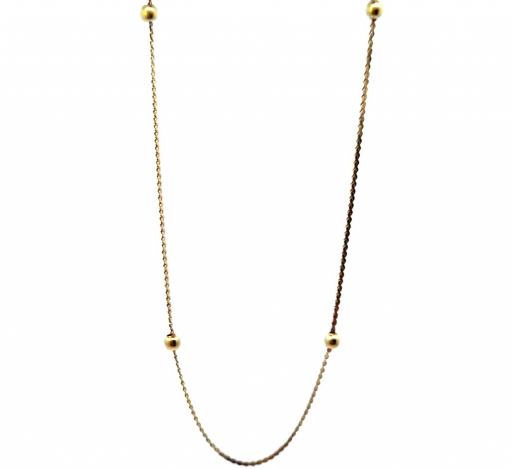 Zlatý řetízek o ryzosti 585/1000, punc čejka. Váha 3,32 g, délka 44,5 cm, šířka řetízku 1 mm, průměr kuliček 3 mm.