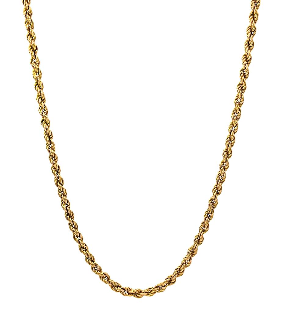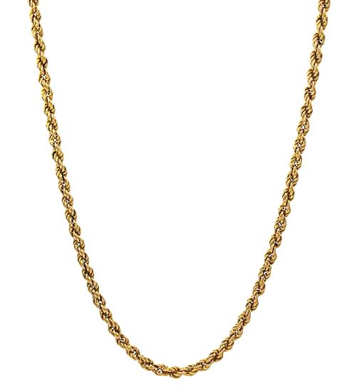Zlatý řetízek o ryzosti 585/1000, punc labuť. Váha 6,28 g, délka 50,7 cm, v nejširším bodě 3 mm.