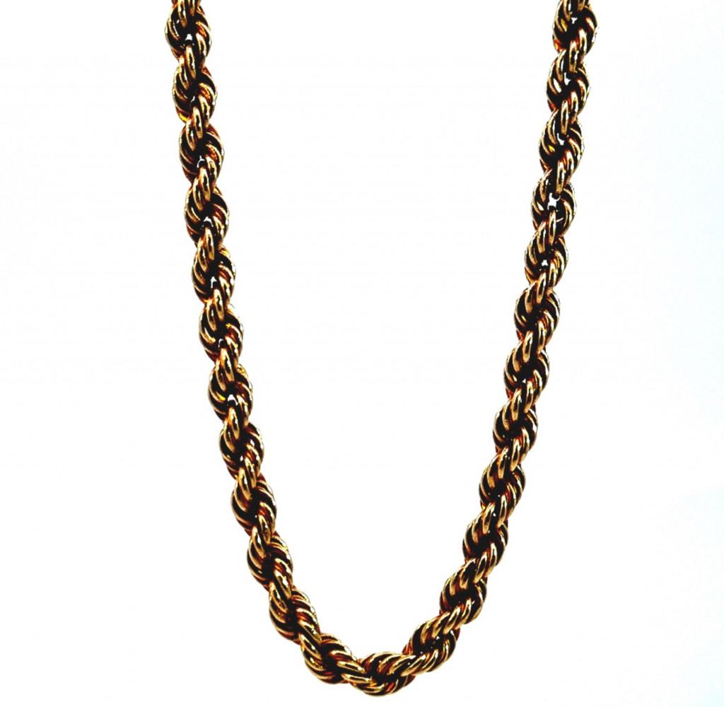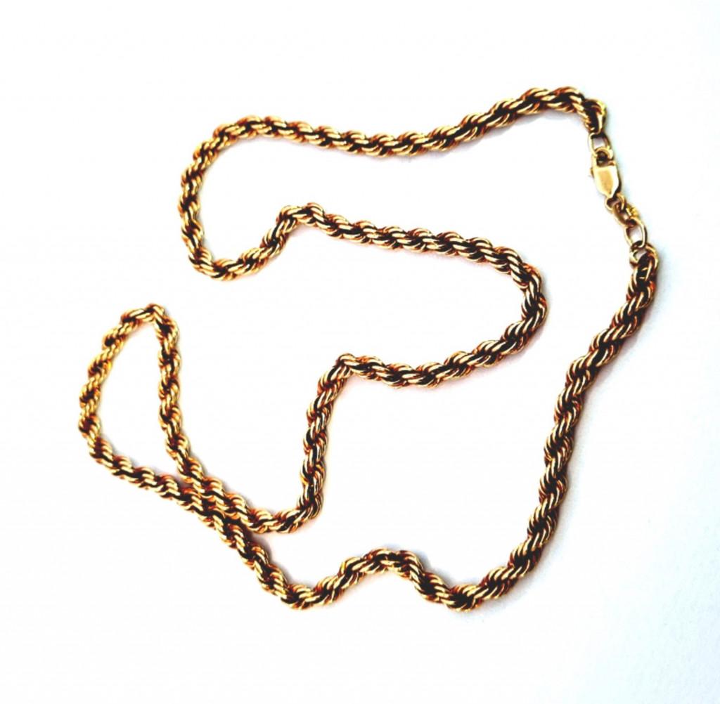 Zlatý řetízek o ryzosti 585/1000, punc labuť. Váha 8,66 g, délka 47 cm, v nejširším bodě 4 mm.