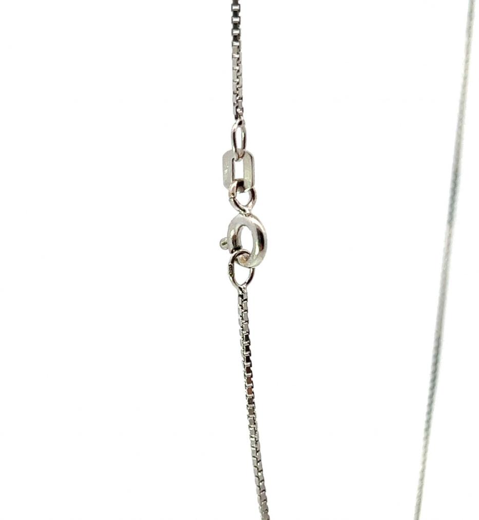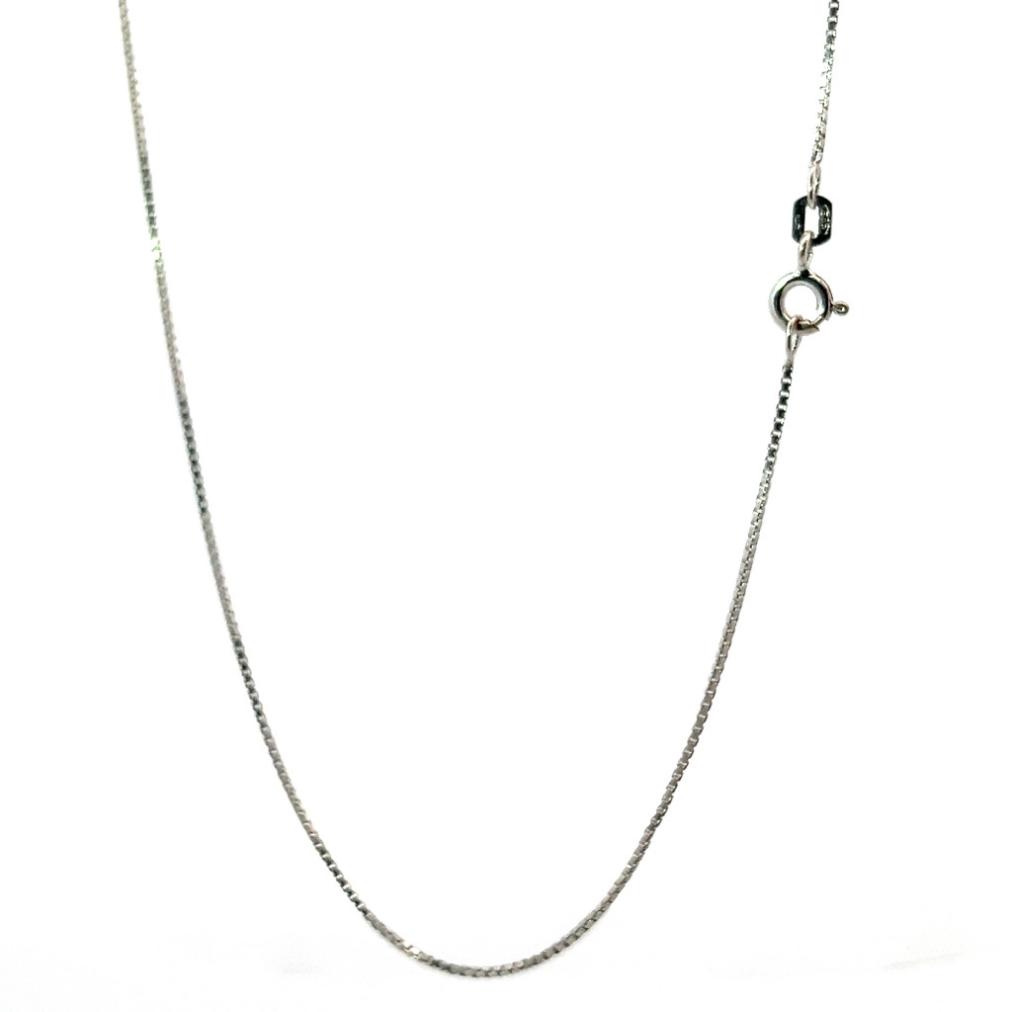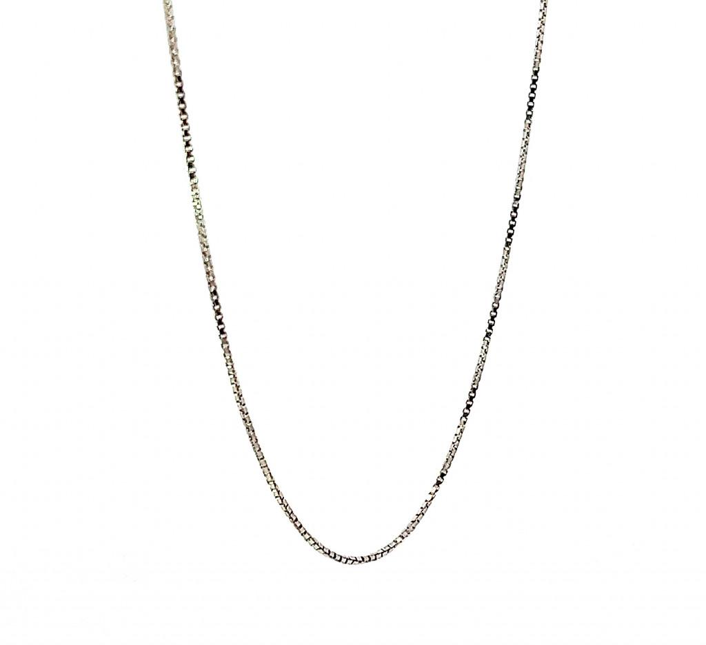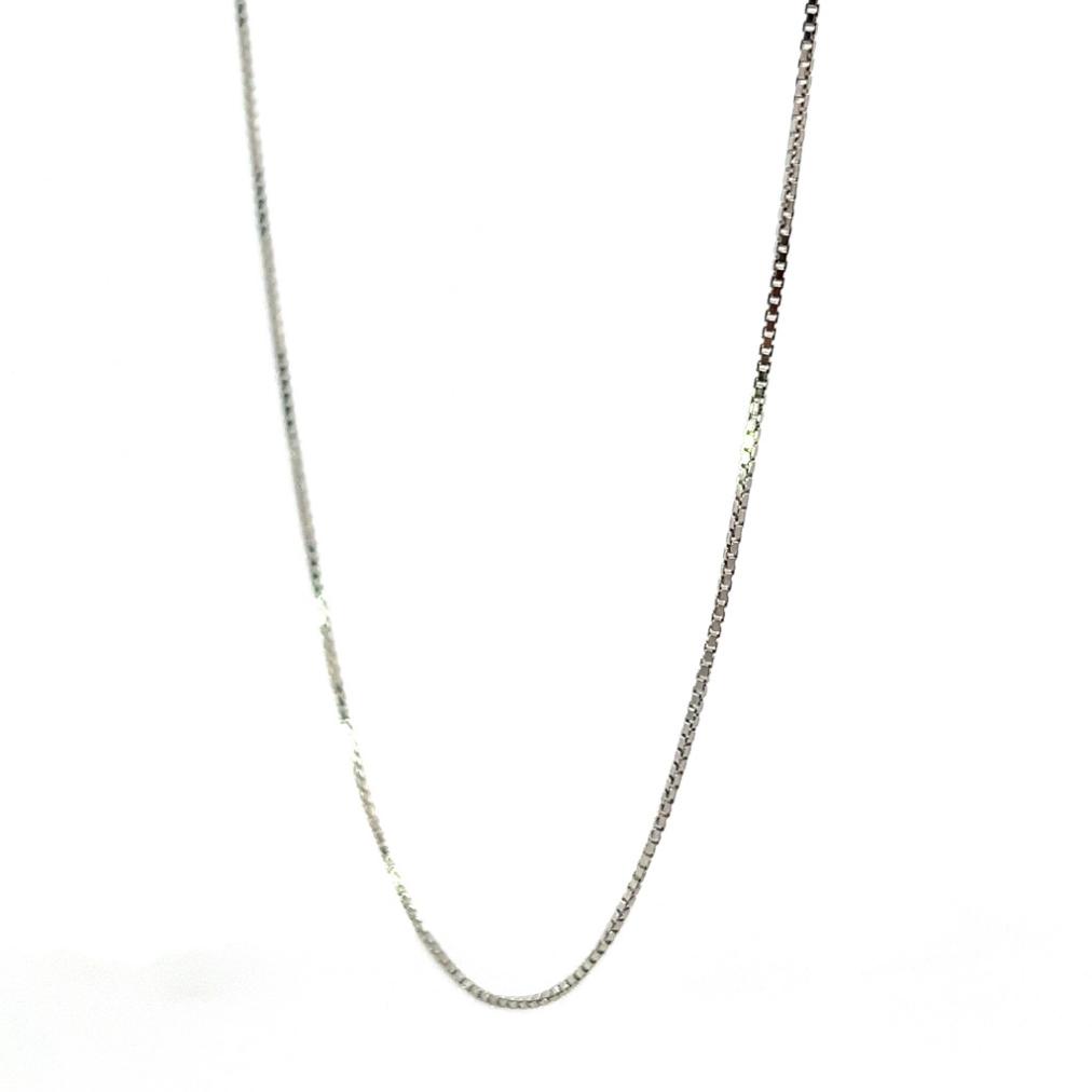 Řetízek typu ´´kostka´´ z bílého zlata o ryzosti 585/1000 s puncem labuť. Váha 2,23 g, délka 45,5 cm, šířka oček je 1 mm.