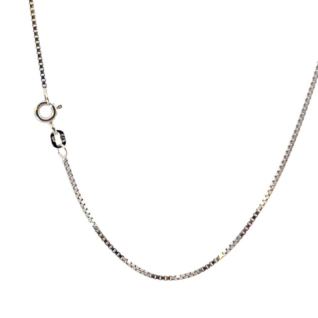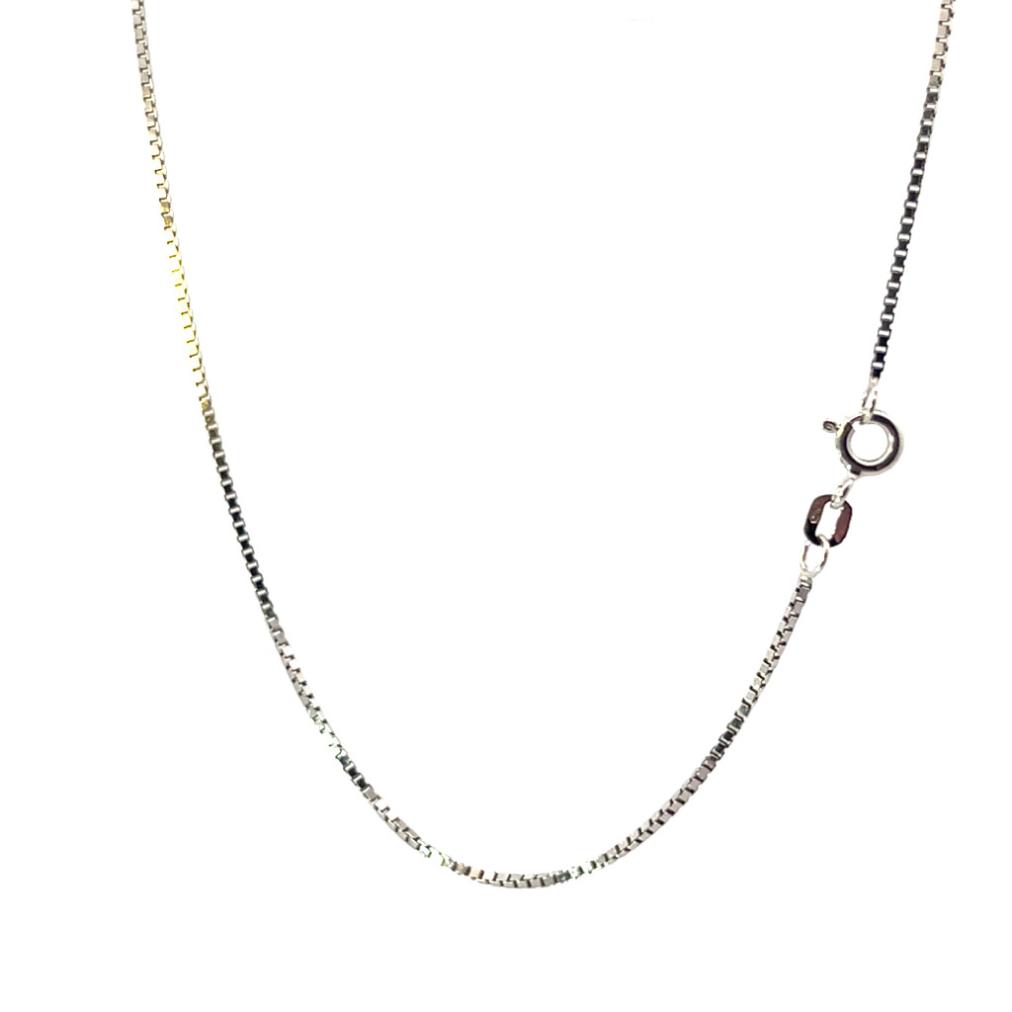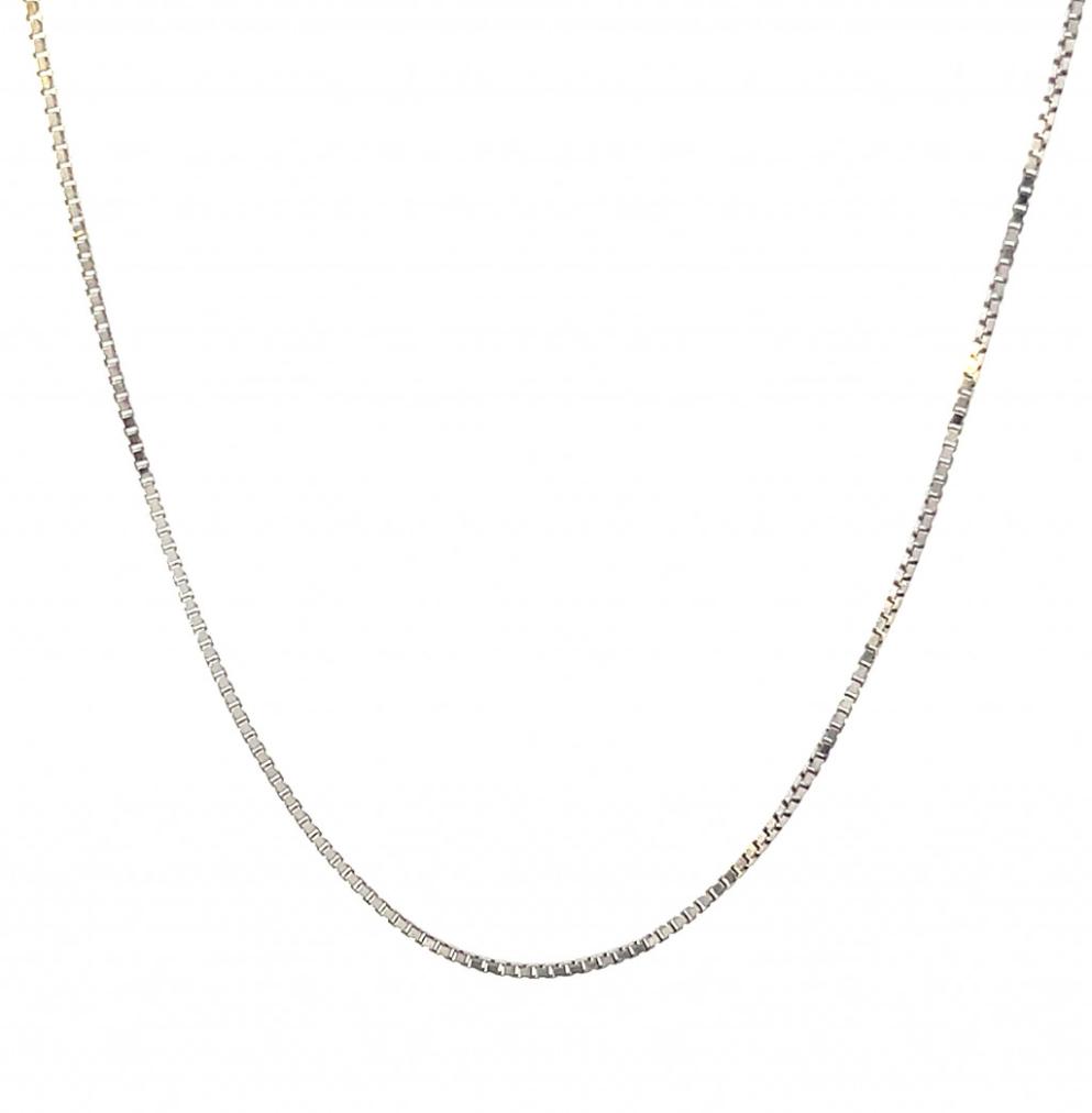 Řetízek z bílého zlata o ryzosti 585/1000 s puncem labuť. Váha 3,15 g, délka 45 cm, šířka řetízku je 1 mm.