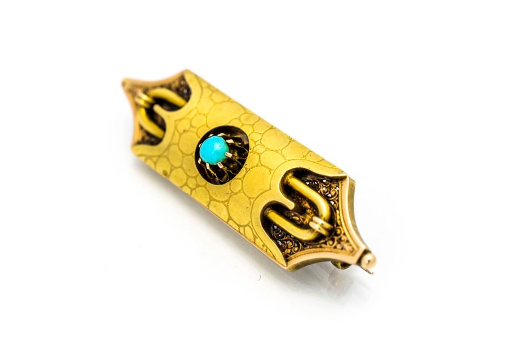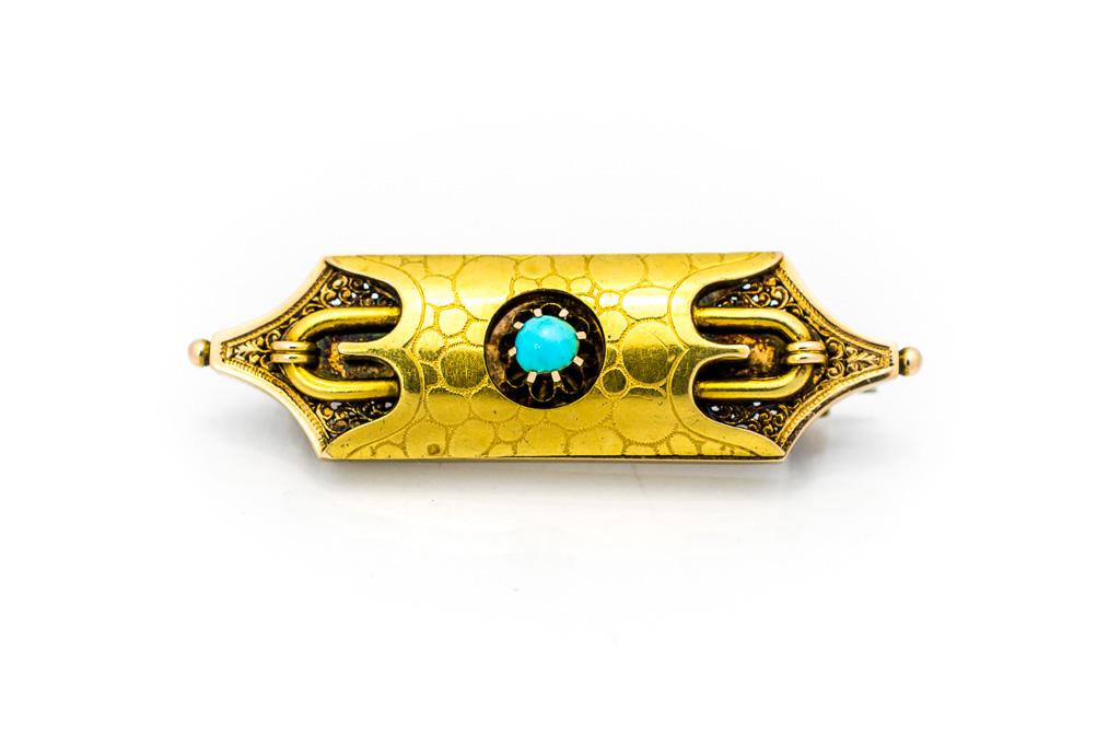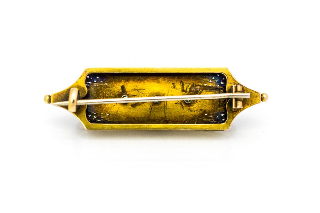 Nádherná designová brož stará téměř 200 let je ze zlata o ryzosti 585/1000, váha celkem 7,17 g.