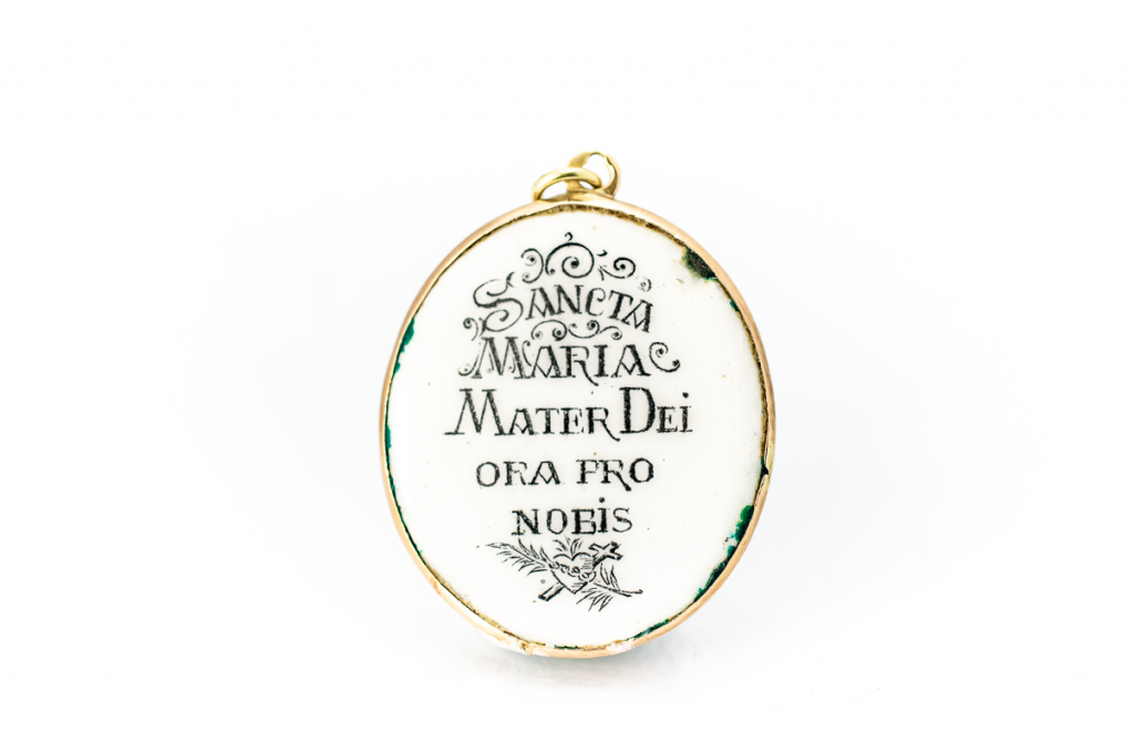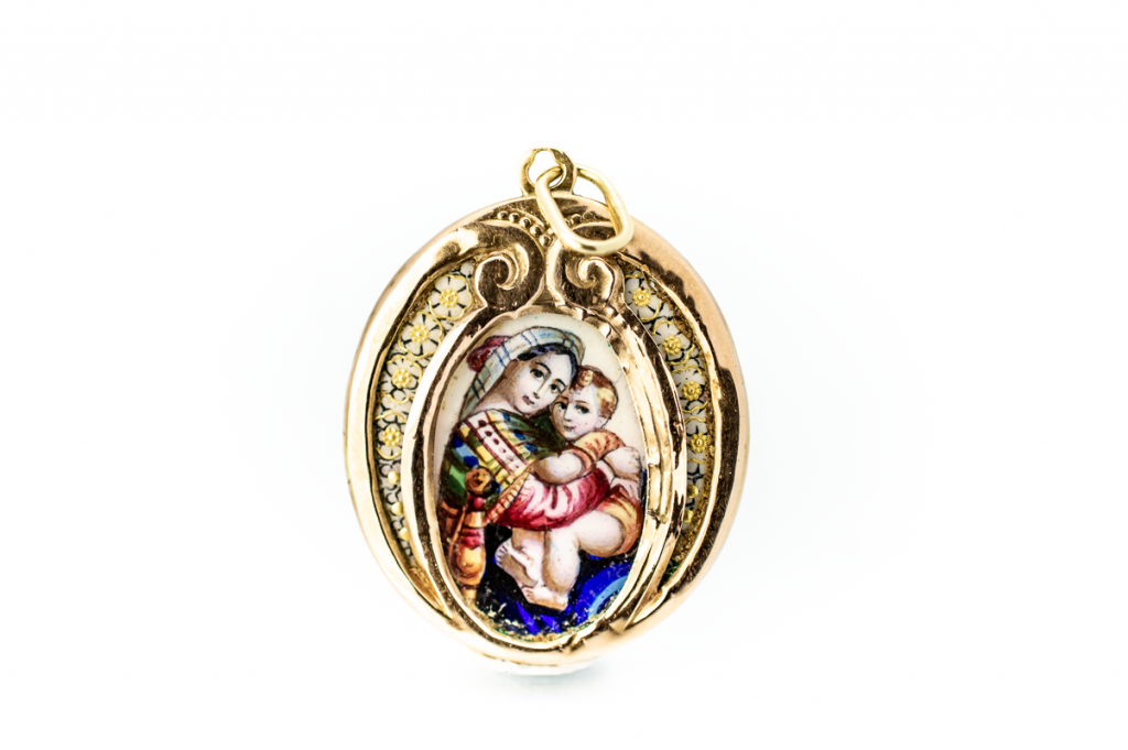 Madonka ve smaltu vsazena do zlata o ryzosti 585/1000, váha celkem 4,70 g, punc labuť, na výšku 25 mm, na zadní straně smalt kousíček pryč.