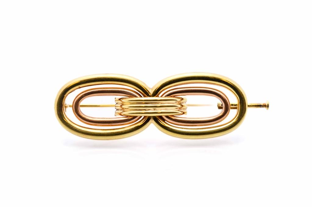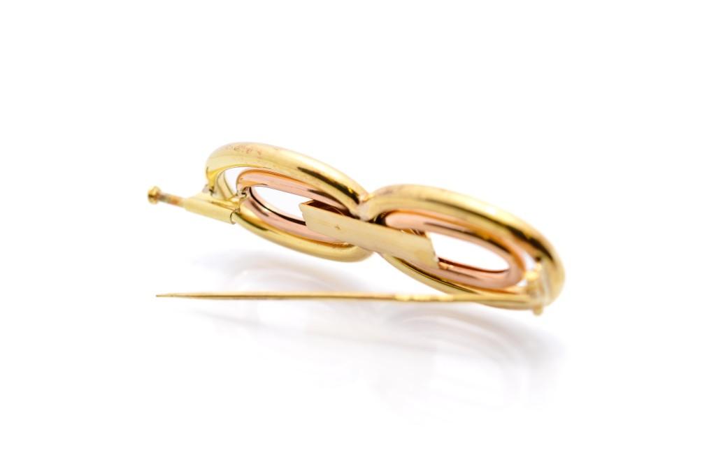 Zlatá brož o ryzosti 585/1000, punc lvíček, váha 5,71 g, délka 48 mm, šířka 16 mm.