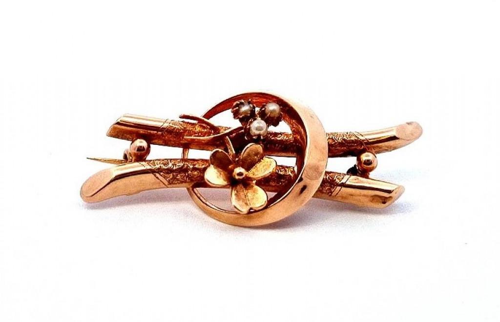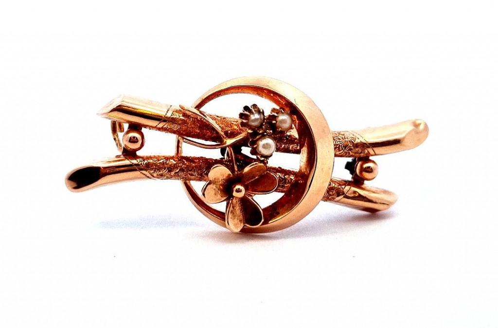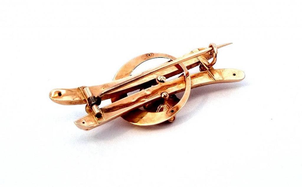 Brož z růžového zlata o ryzosti 585/1000, punc AV. Váha 3,27 g, délka 43 mm, v nejširším bodě 18 mm.
