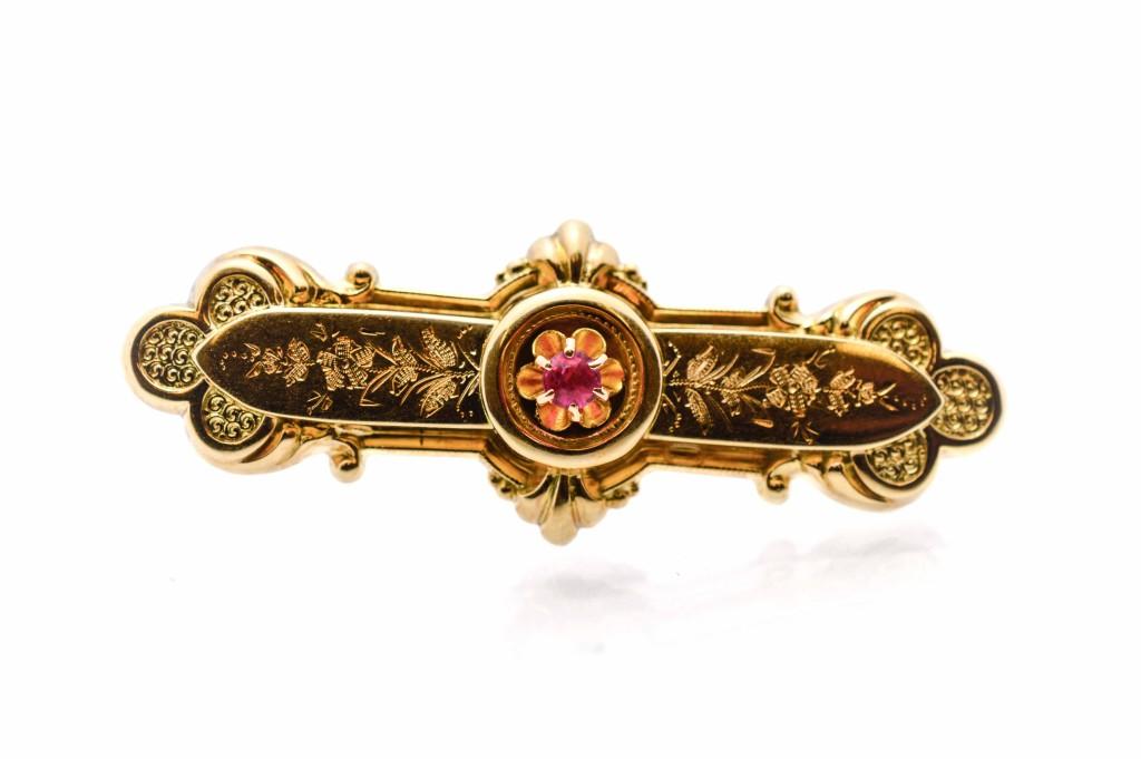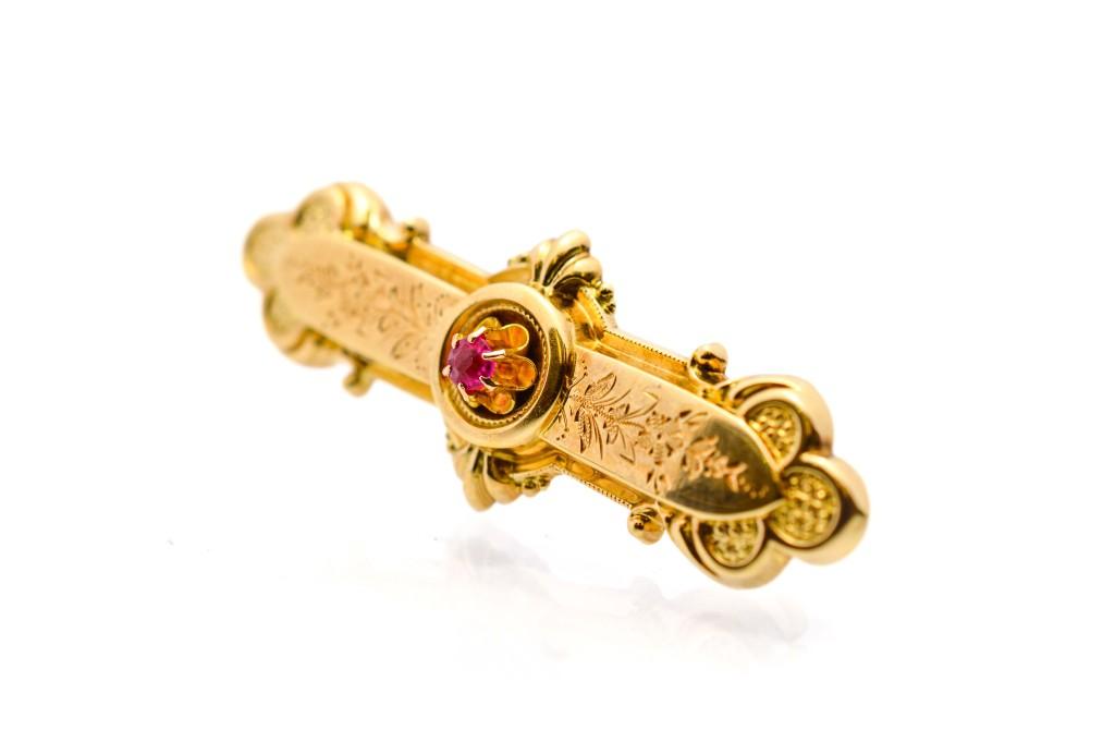Starožitná zlatá brož s rubínem, váha 4,02 g, délka 49 mm, v nejširším bodě 18 mm. Ryzost 580/1000, punc liška. Kámen je syntetický.