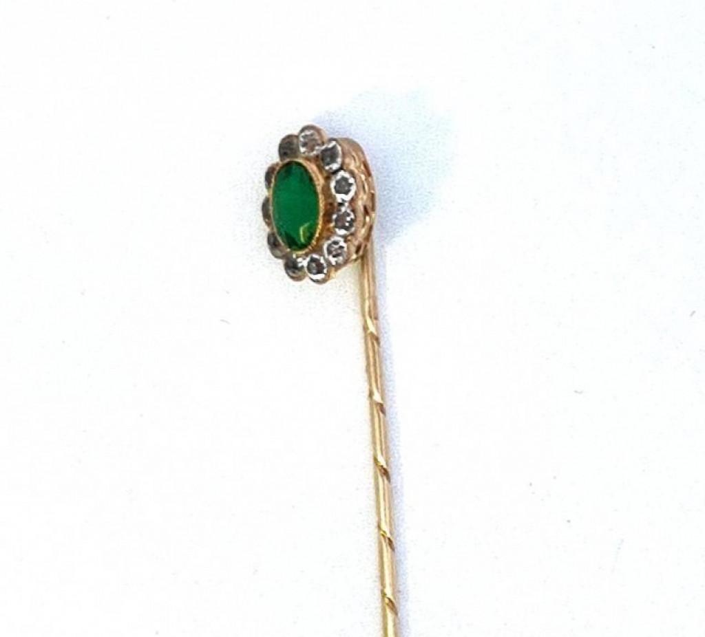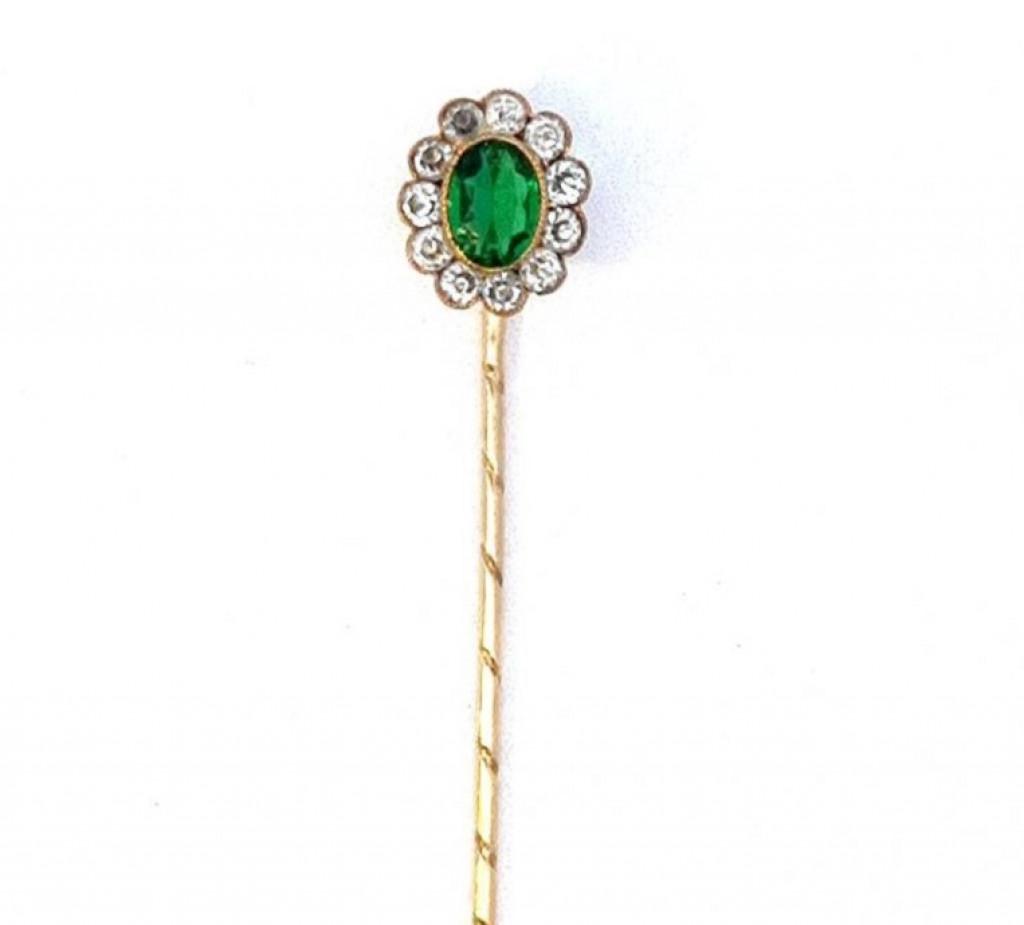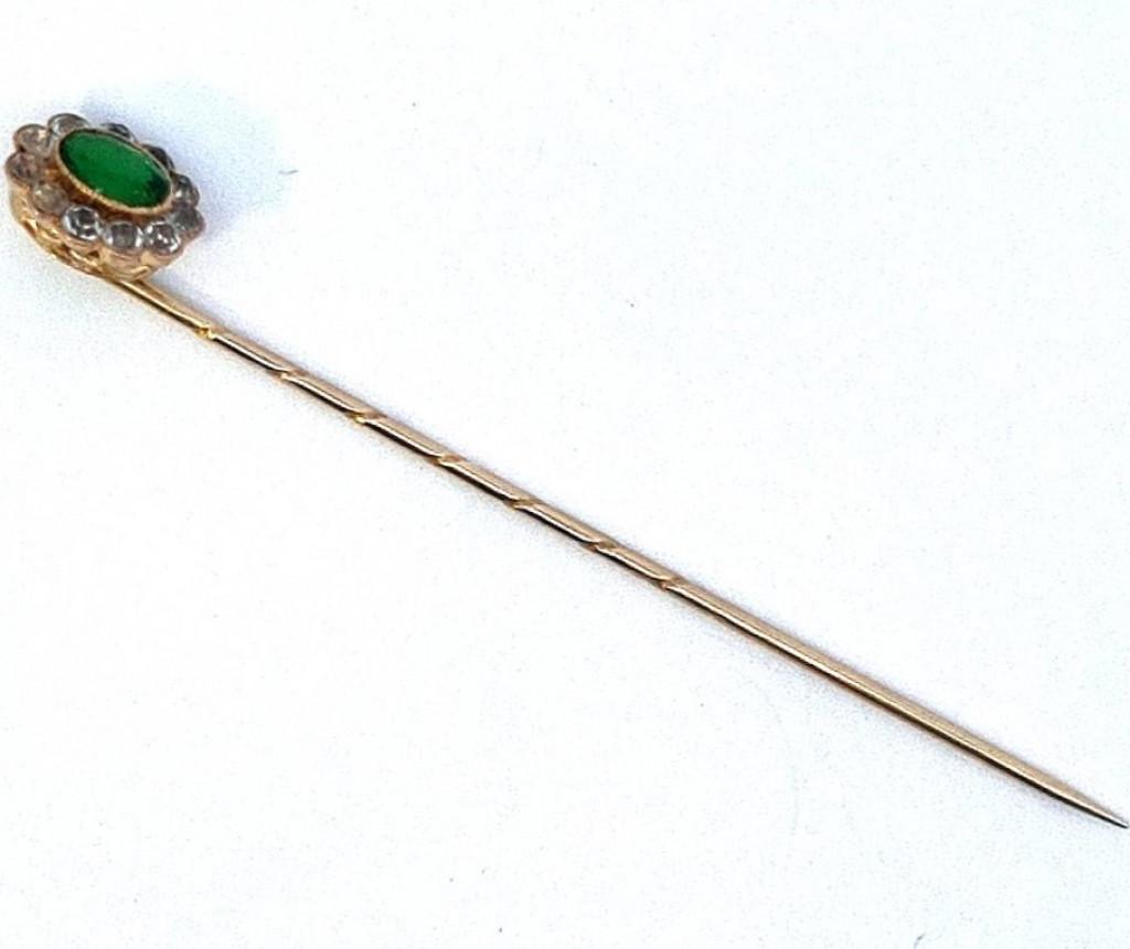 Starožitná zlatá jehlice se zeleným kamenem a zirkony