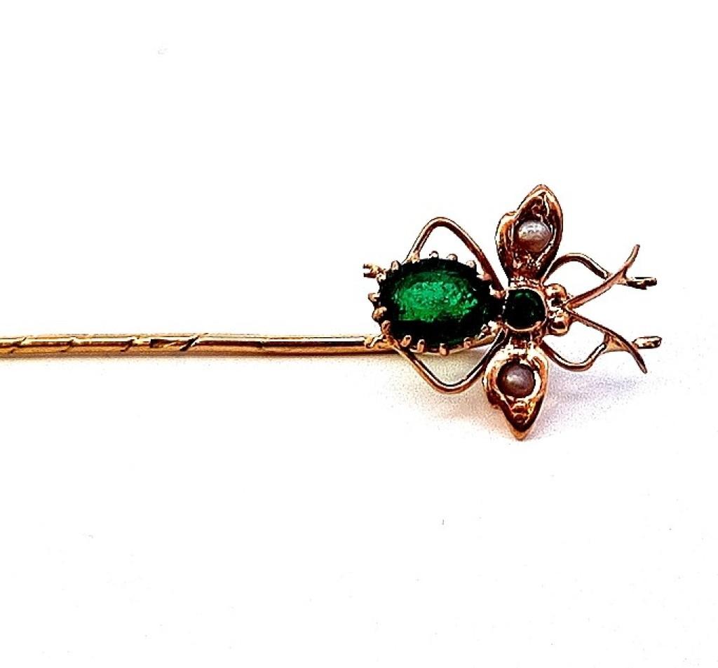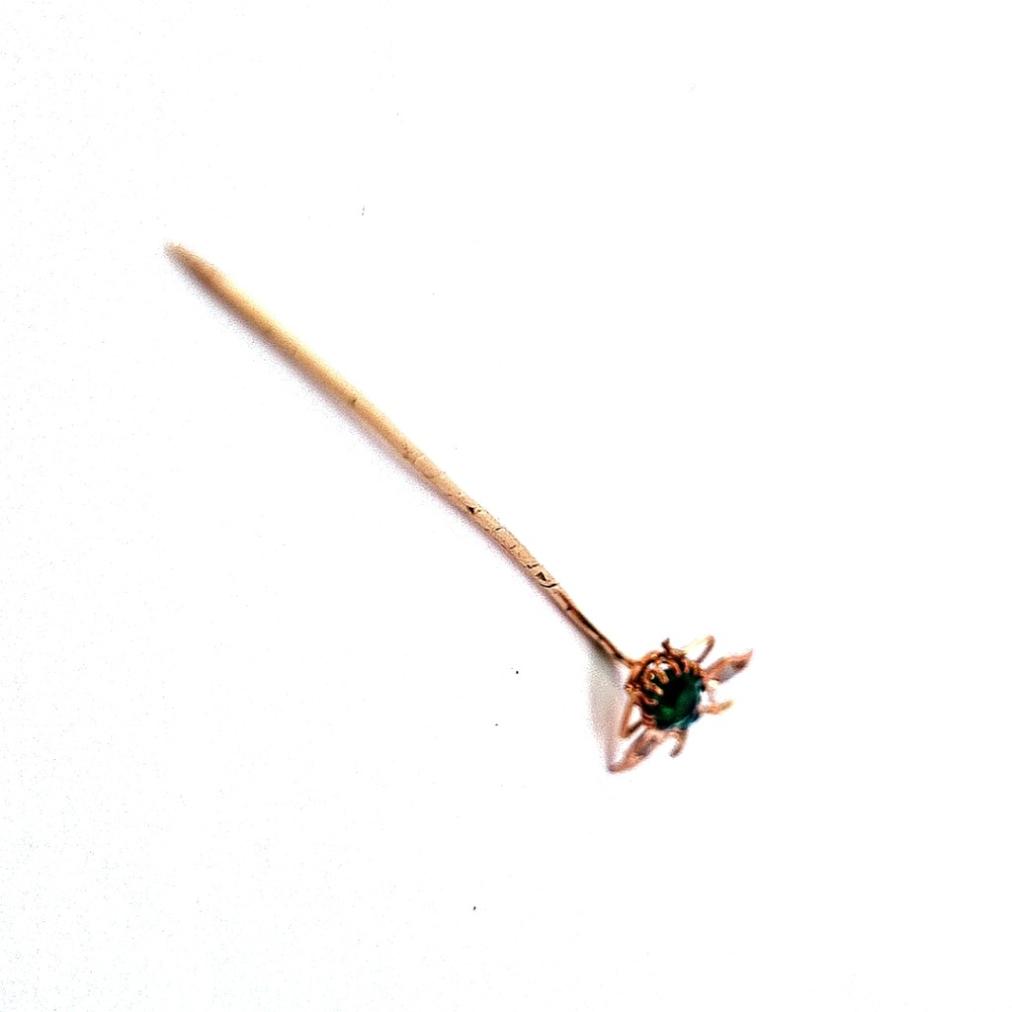 Starožitná zlatá jehlice se zelenými kamínky a perličkami