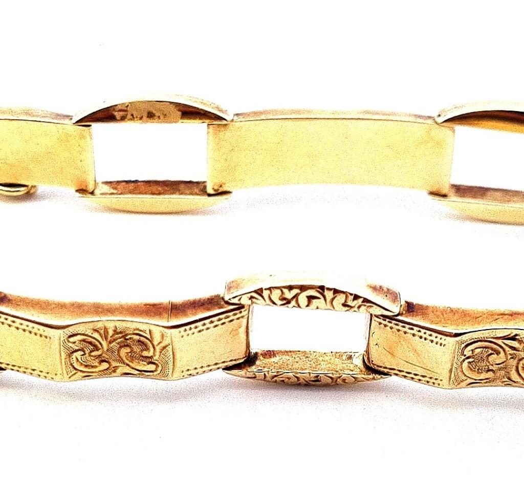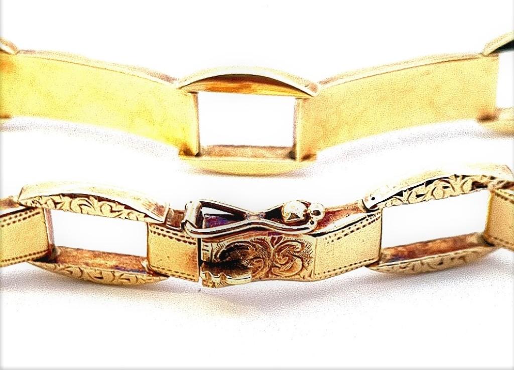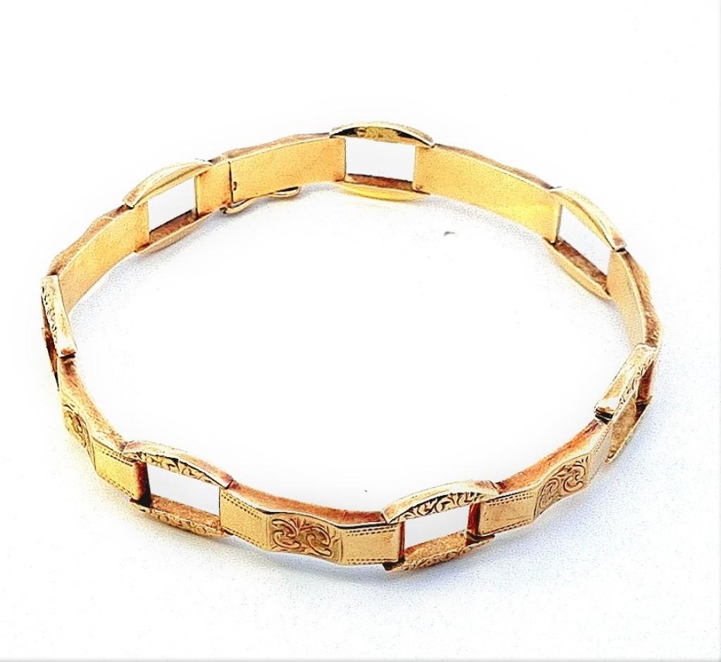 Zlatý náramek o ryzosti 585/1000, punc lvíček, váha 9,75 g. Šířka 10 mm, délka včetně zapínání 19 cm.