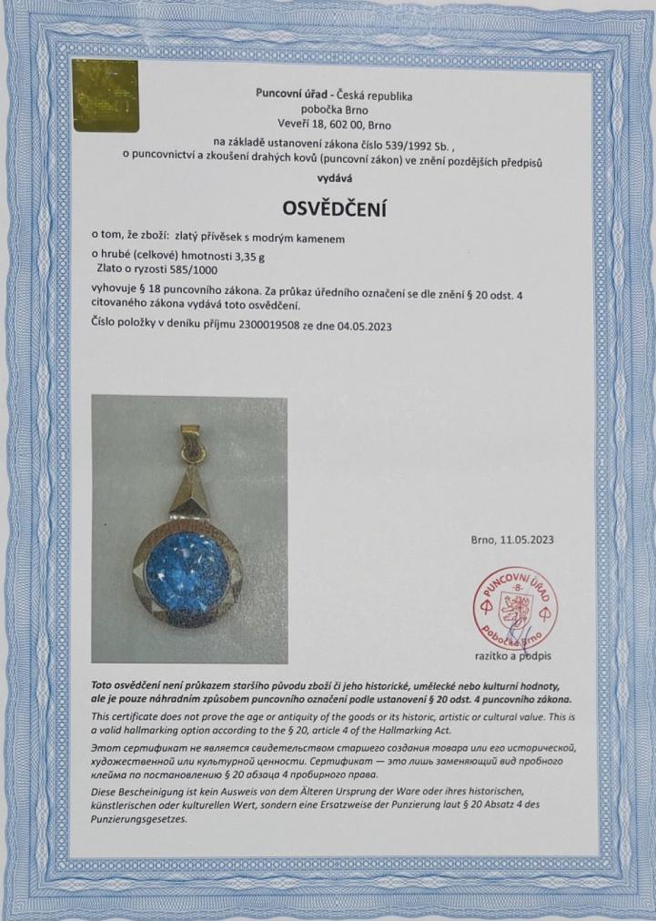 Zlatý přívěs o ryzosti 585/1000, osvědčení z puncovního úřadu, váha 3,30 g, výška celkem i s očkem 29 mm, šířka 15 mm, průměr kamene - 11 mm. Kámen je syntetický.