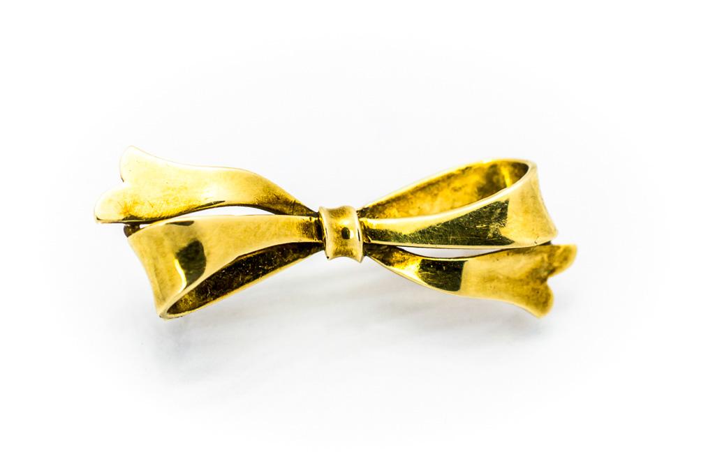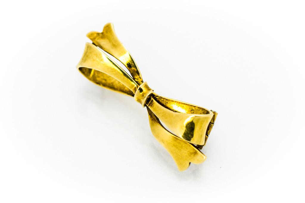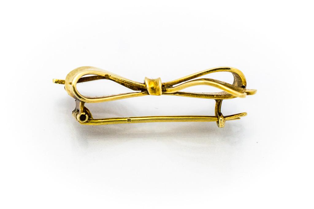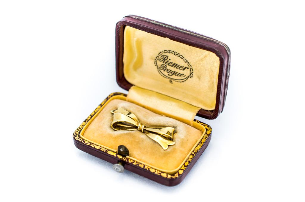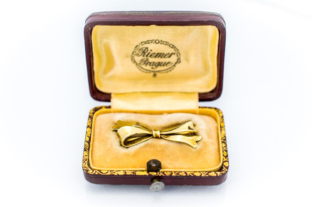 Zlatá brož v původní etui s nápisem Riemer Prague. Au 585/1000, váha 2,69 g, punc čejka.