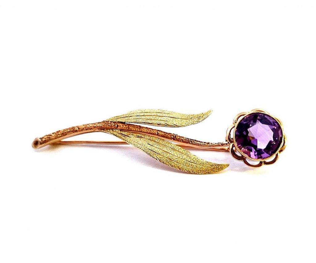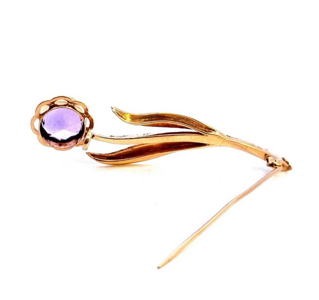 Brož z kombinace žlutého a růžového zlata o ryzosti 585/1000, punc labuť. Váha 8,36 g, délka 64 mm, v nejširším bodě 16 mm, průměr kamene 12 mm. Kámen je syntetický.