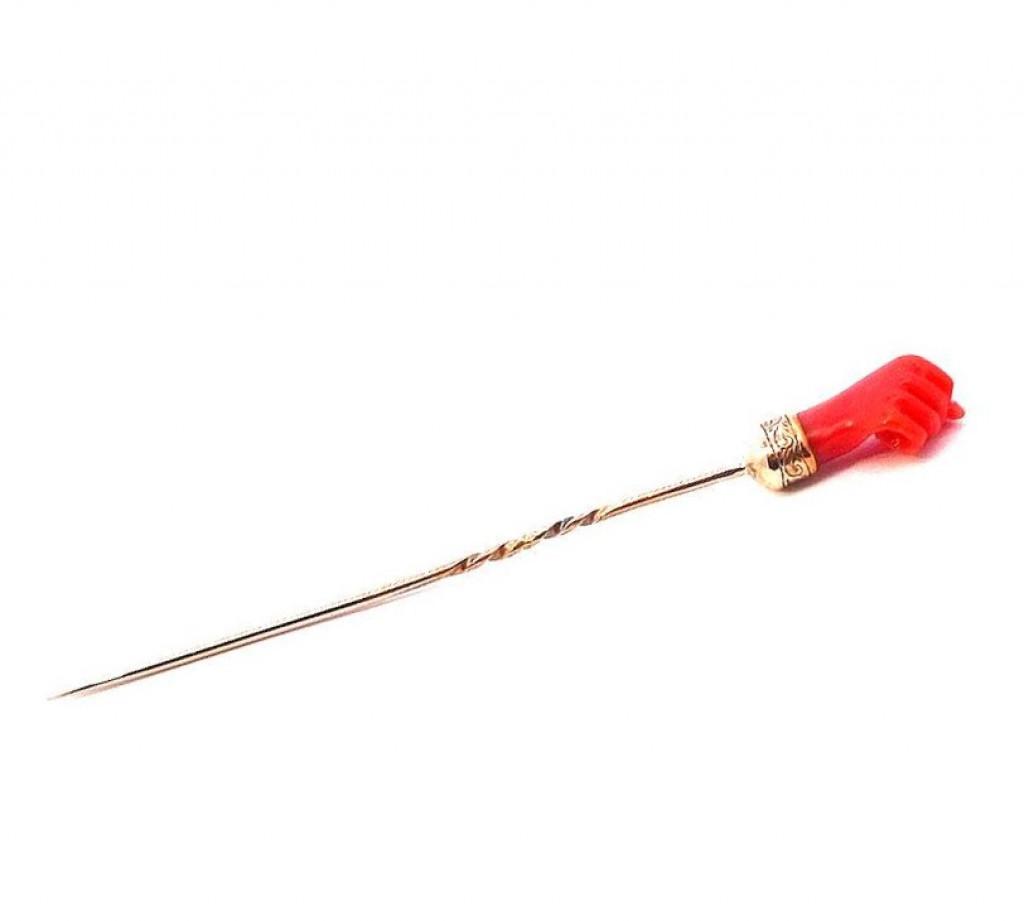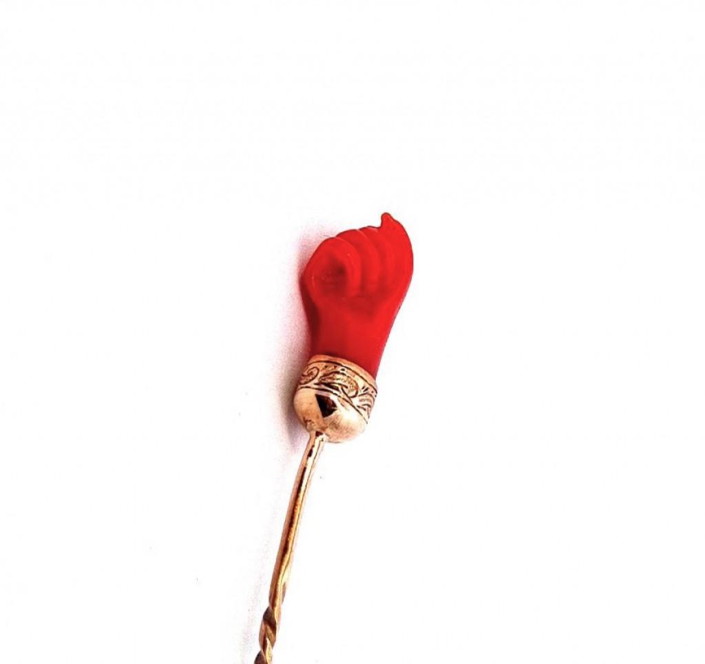 Zlatá jehlice s korálem, ruka