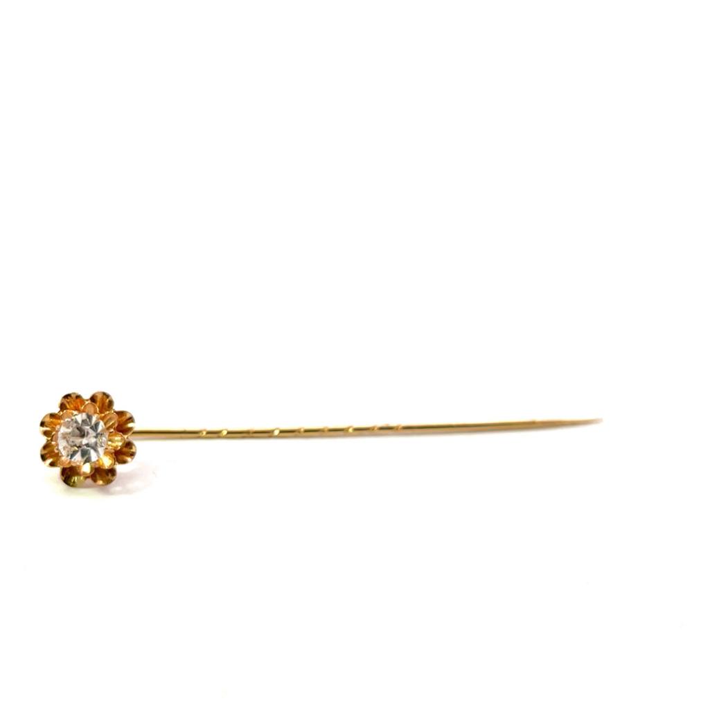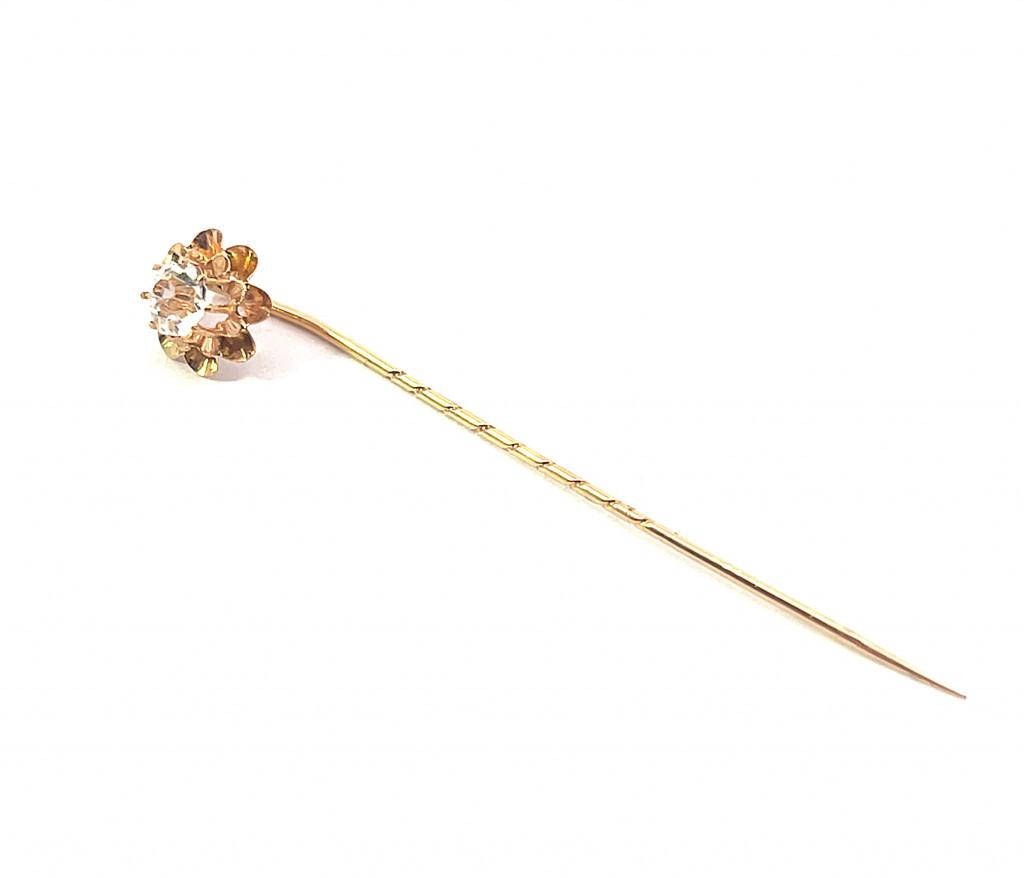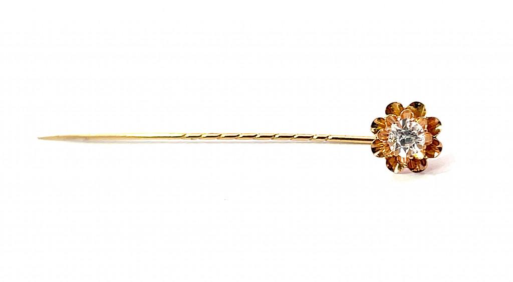 Zlatá jehlice s ozdobou ve tvaru květiny, doplněna zirkonem. Zlato o ryzosti 585/1000 s puncem labuť. Délka jehly 55 mm, průměr květiny 9 mm, průměr kamene 5 mm, váha 0,88 g. Kámen je syntetický a na dvou místech odštípnutý.