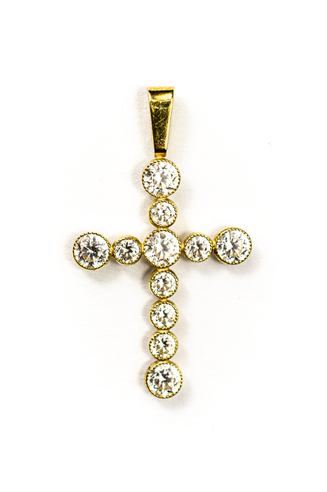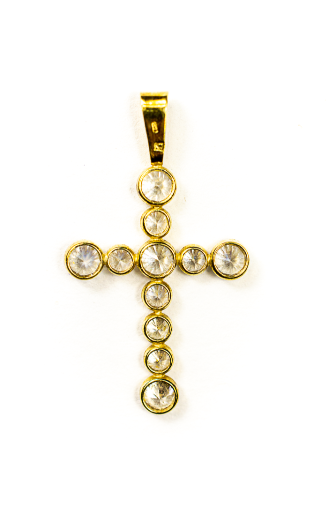 Zlatý křížek o ryzosti 585/1000, váha 1,68 g, na výšku 35 mm.